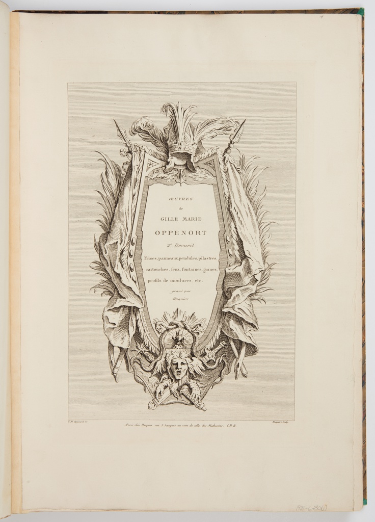 Printed center in plate: OEUVRES / de / GILLE MARIE / OPPENORT / 2e. Recueil / Frises, panneaux, pendules, pilastres, / cartouches, feux, fontaines, gaines, / profils de moulures, etc. / gravé par / Huquier; Printed lower center, in plate: AParis chés Huquier rue S. Jacques au coin de celle des Mathurins. C.P.R.; Inscribed in graphite, lower right, in margin: 1921-6-230(1)