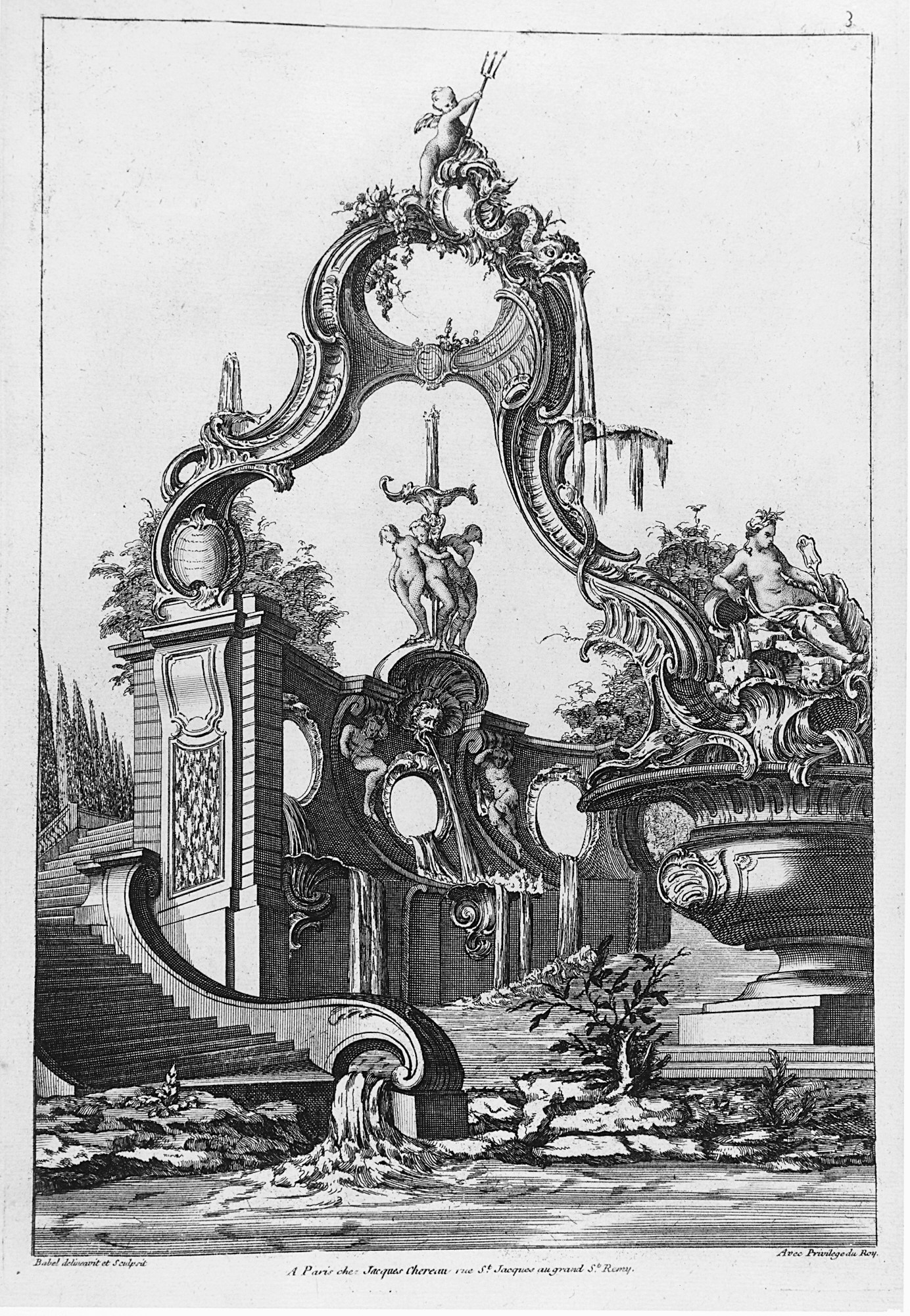 Print, Rocaille Arch and Fountain with Three Graces; Designed by Pierre Edme Babel (French, 1720–1775); Published by Jacques Chéreau (French, 1688–1776); France; engraving on off-white laid paper; Sheet: 34.4 x 23.5 cm (13 9/16 x 9 1/4 in.) Platemark: 28.3 x 19 cm (11 1/8 x 7 1/2 in.); Purchased for the Museum by the Advisory Council; 1921-6-231-4