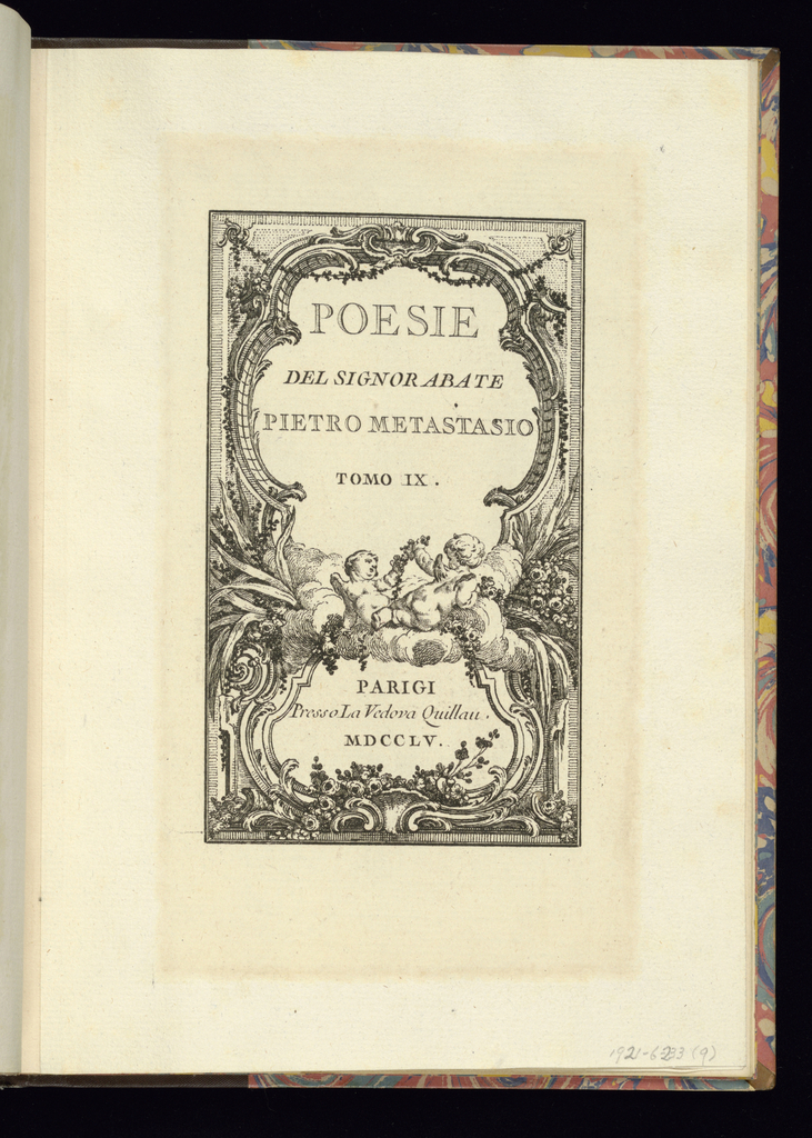 Lettered in plate, in the center: POESIE/ DEL SIGNOR ABATE /PIETRO METASTASIO/ TOMO IX/ PARIGI / Presso La Vedova Quillau/ M.DCC.LV.; inscribed in graphite, lower right margin: 1921-6-233 (9)