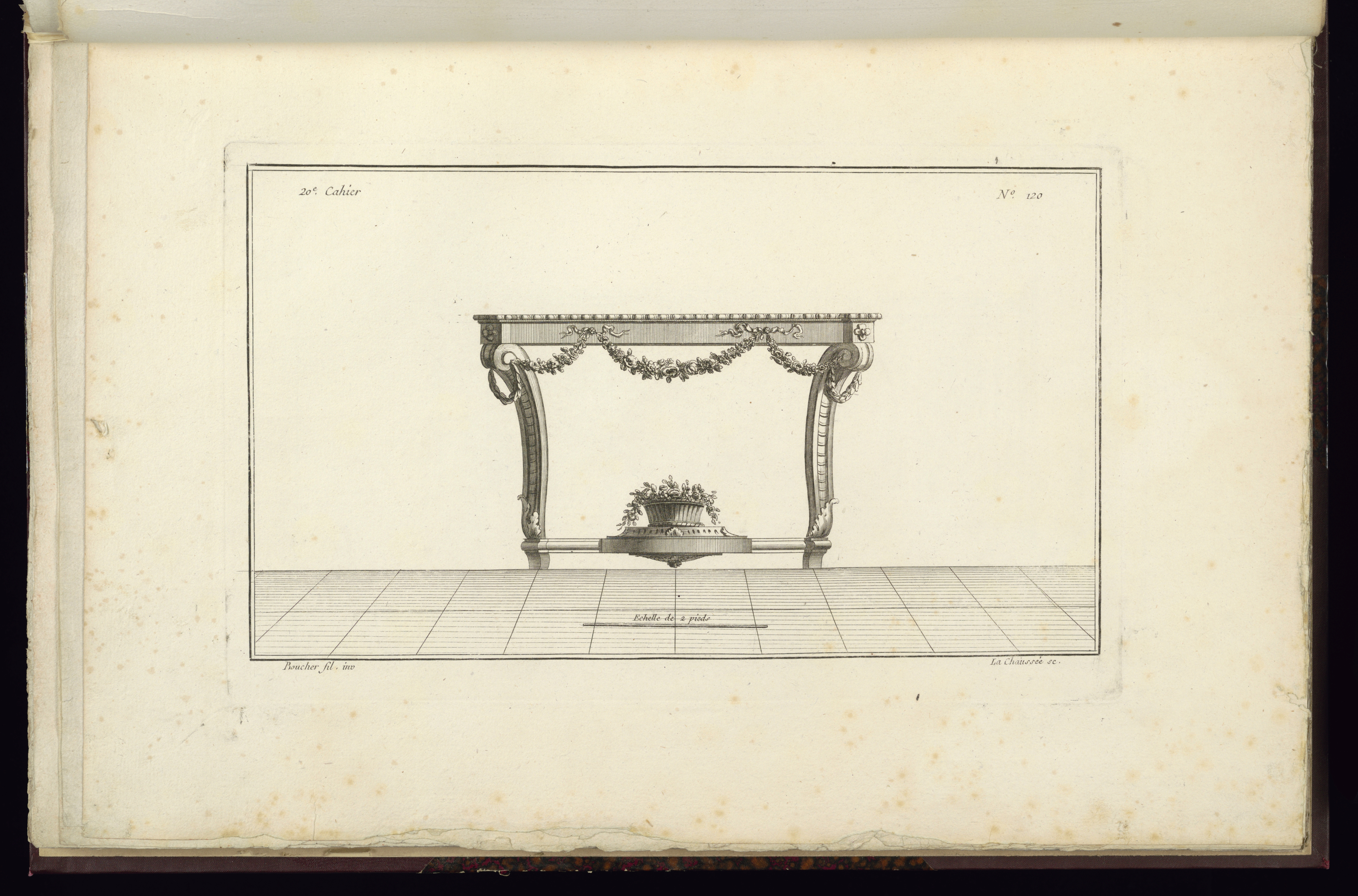 Print, Design for a Side Table with a Floral Bouquet; Designed by Jules-François Boucher le fils (French, 1736 – 1782); Print Maker: Lachausée (Active in France, 17??–18??); Published by Chez Le Pere et Avaulez, Charles Le Pere (French, active 18th century), Pierre-Michel Avaulez (French, active 1772 – d. 1774); France; engraving on off white laid paper; Purchased for the Museum by the Advisory Council; 1921-6-253-17
