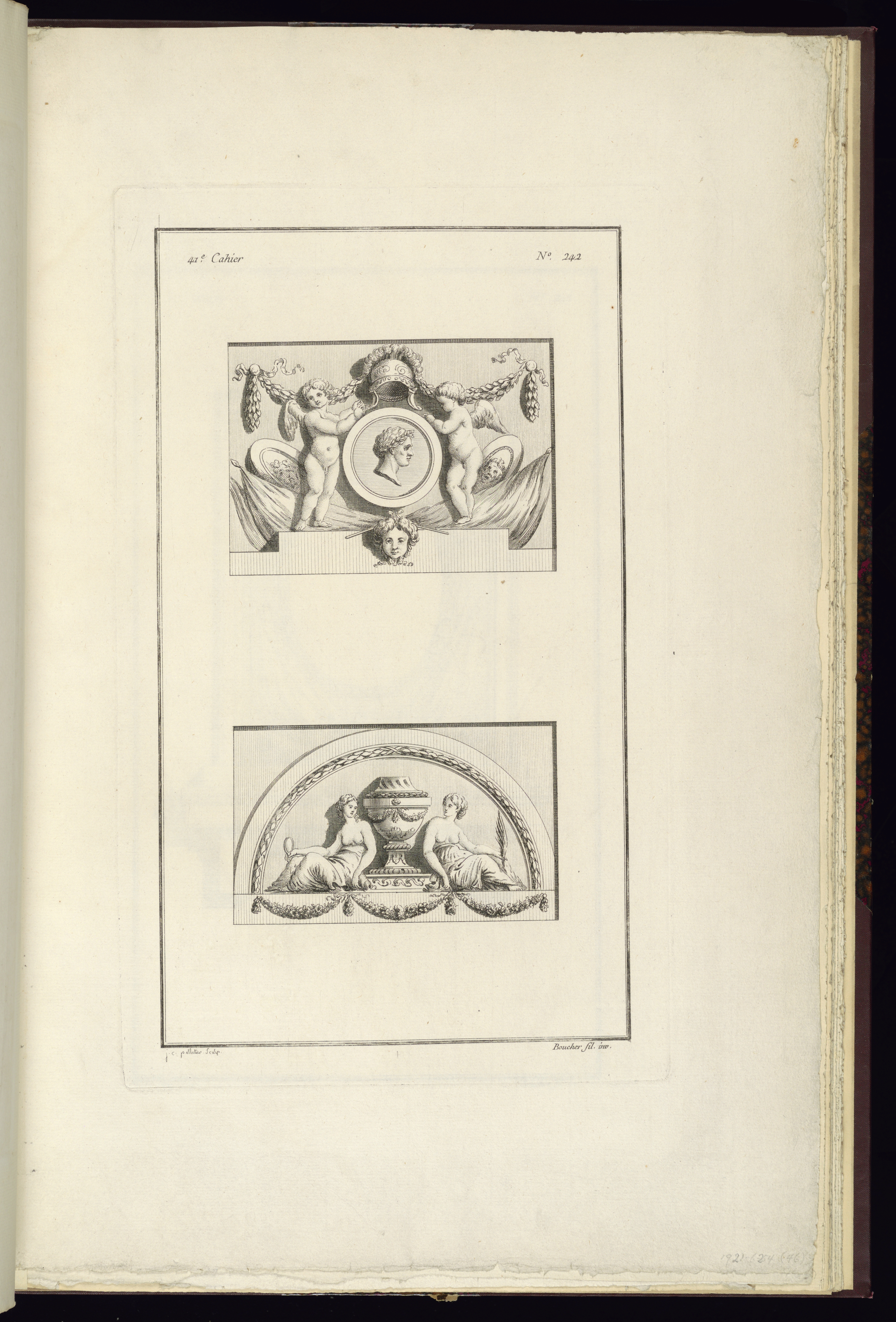 Print, Designs for Carved Reliefs; Designed by Jules-François Boucher le fils (French, 1736 – 1782); Print Maker: Jean Pelletier (French, born ca. 1736); Published by Chez Le Pere et Avaulez, Charles Le Pere (French, active 18th century), Pierre-Michel Avaulez (French, active 1772 – d. 1774); France; engraving on off white laid paper; Purchased for the Museum by the Advisory Council; 1921-6-254-46