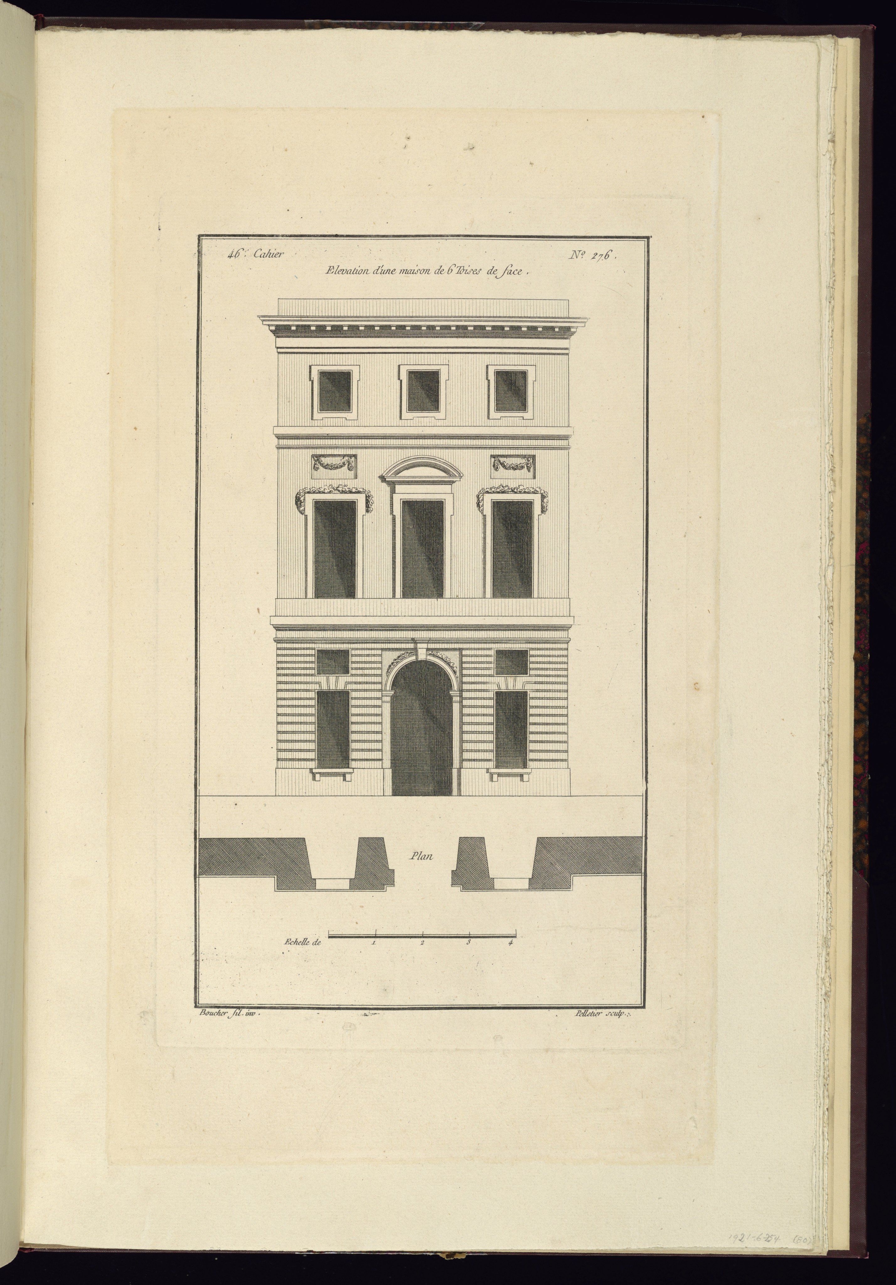 Printed upper left, in plate: 46e. Cahier; Printed upper center, in plate: Elevation d'une maison de 6 toises de face.; Printed upper right, in plate: No. 276.; Inscribed in graphite, lower right, in margin: 1921-6-254 (80)