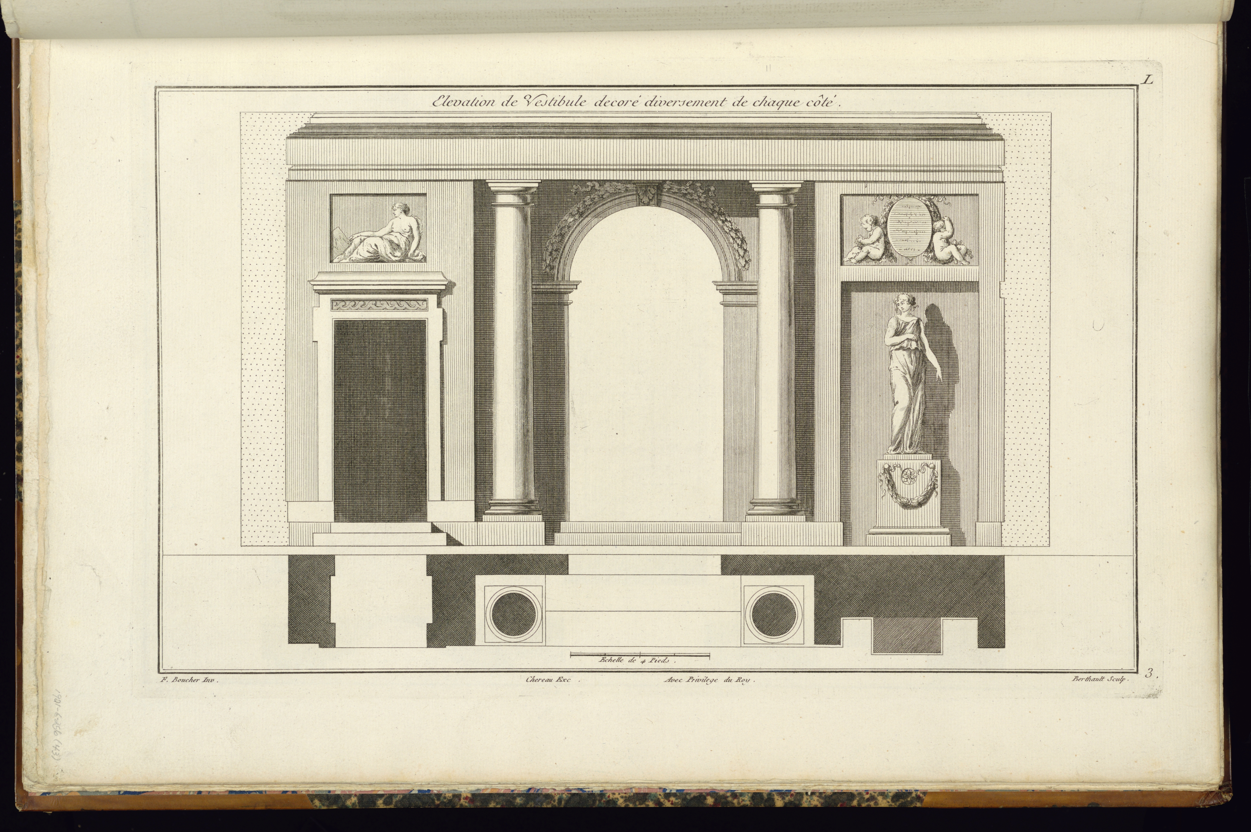 Printed upper center, in plate: Elevation de Vestibule decoré diversement de chaque côté.; Printed upper right, in plate: L; Printed lower center, in plate: Chereau Exc. Avec Privilége du Roy.; Printed lower right, in plate: 3; Inscribed in graphite, lower left, in margin: 1921-6-256 (43)