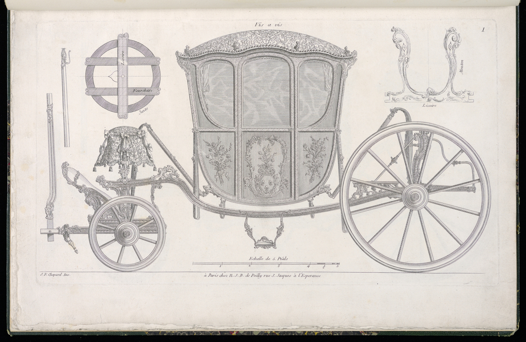 Printed in plate, upper right: 1; Printed in plate, upper center: Vis a vis; Printed in plate, upper left, superimposed on carriage parts: Lisoire / Fourchette / Jante; Printed in plate, upper right, adjacent to carriage parts: Mouton / Lisoire; Printed in plate, lower center, above the scale: Echelle de 5. Pièds; Printed in plate, lower center: à Paris chez N. J. B. de Polly rue S. Jacques à l'Esperance