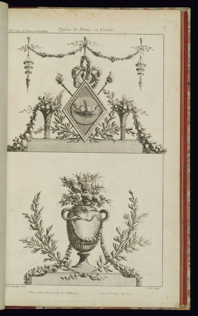 Printed upper left, in plate: XIe. Cahier de l'Oeuvre de La Londe; Printed upper center, in plate: Dessus de Portes et Cartels; Printed upper right, in plate: L; Printed lower right, in plate: 1; Printed lower center, in plate: A Paris chez Chereau rüe des Mathurins Avec Privilege du Roy