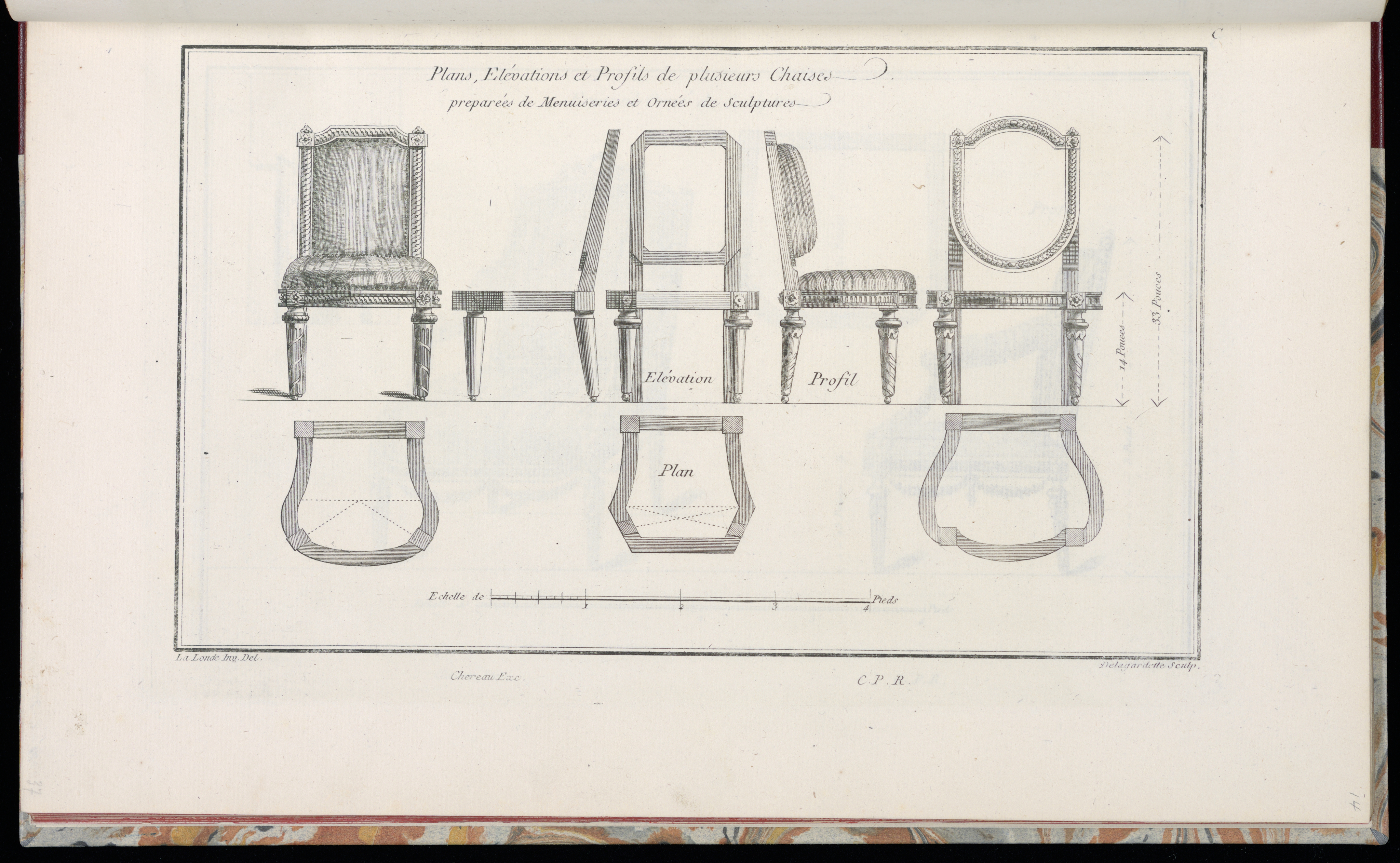 Printed upper center, in plate: Plans, Elévations, et Profils de plusieurs Chaises / preparées de Menuiseries et Ornées de Sculptures; Printed upper right, in plate: C; Printed lower center, in plate: Chereau Exc C.P.R.; Printed lower right, in plate 2; Inscribed in graphite, lower left, in margin: 37; Inscribed in graphite, lower right, in margin: 14