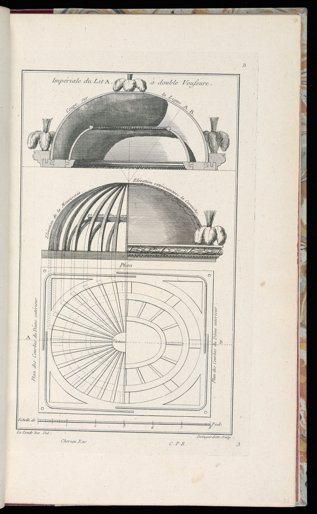 Printed upper center, in plate: Impériale du lit A. à double Voussure; Printed upper right, in plate: B; Printed upper center, in plate: Coupe sur la ligne A. B.; Printed center left, in plate: Elévation de la Menuiserie.; Printed center right, in plate: Elévation extérieure avec la Corniche.; Printed lower left, vertically, in plate: Plan des Courbes du Dôme extérieur; Princed lower right, vertically, in plate: Plan des Courbes du Dôme intérieur; Printed lower center, in plate: Chereau Exc. C.P.R.; Printed lower right, in plate: 3; Inscribed in graphite, upper right, in margin: 9; Inscribed in graphite, lower right, in margin: 32
