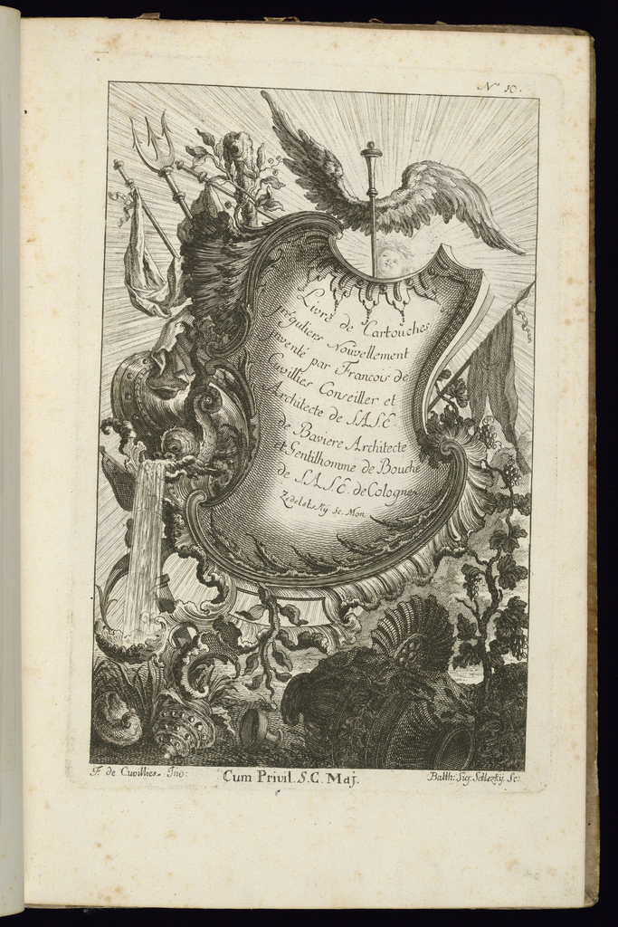 Printed in plate, within cartouche: Livre de Cartouches / iréguliers Nouvellement / inventé par François de / Cuvillies Conseiller et / Architecte de S. A. S. E. / de Baviere Architecte / et Gentilhomme de Bouche de S. A. S. E. de Cologne. / Zedeletskÿ sc. Mon; upper right: No. 10.; lower center: Cum Privil. S. C. Maj.