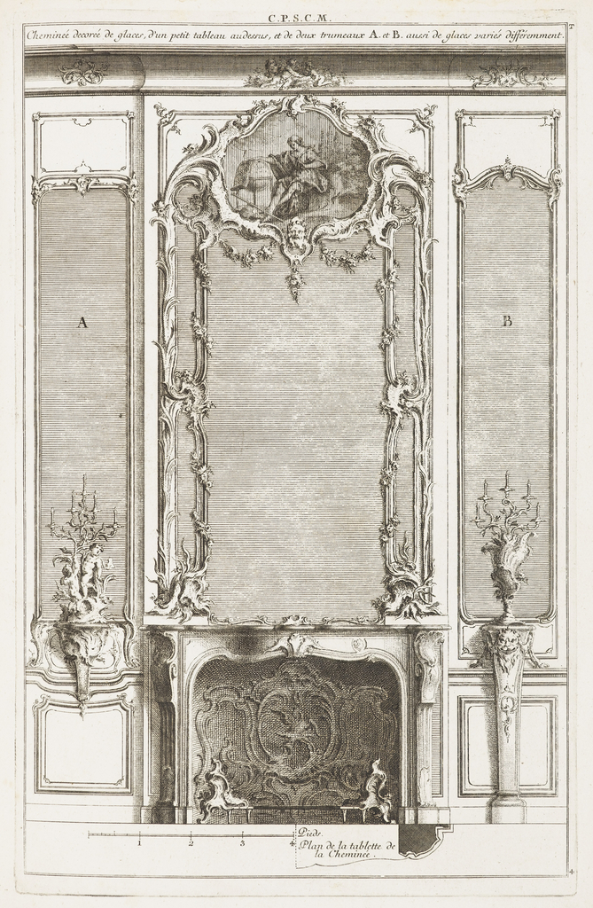 Print, Chiminée decorée de glaces (Fireplace Decorated with Mirrors), in Livre de décoration de lambris (Book of Panelling Decoration); Designed by François de Cuvilliés the Elder (Belgian, active Germany, 1695 - 1768); Engraved by Carl Albert von Lespilliez (German, 1723 - 1796); Germany; engraving and etching on white laid paper; Sheet: 42.5 x 29 cm (16 3/4 x 11 7/16 in.) Platemark: 35.8 x 23.2 cm (14 1/8 x 9 1/8 in.); Purchased for the Museum by the Advisory Council; 1921-6-283-108