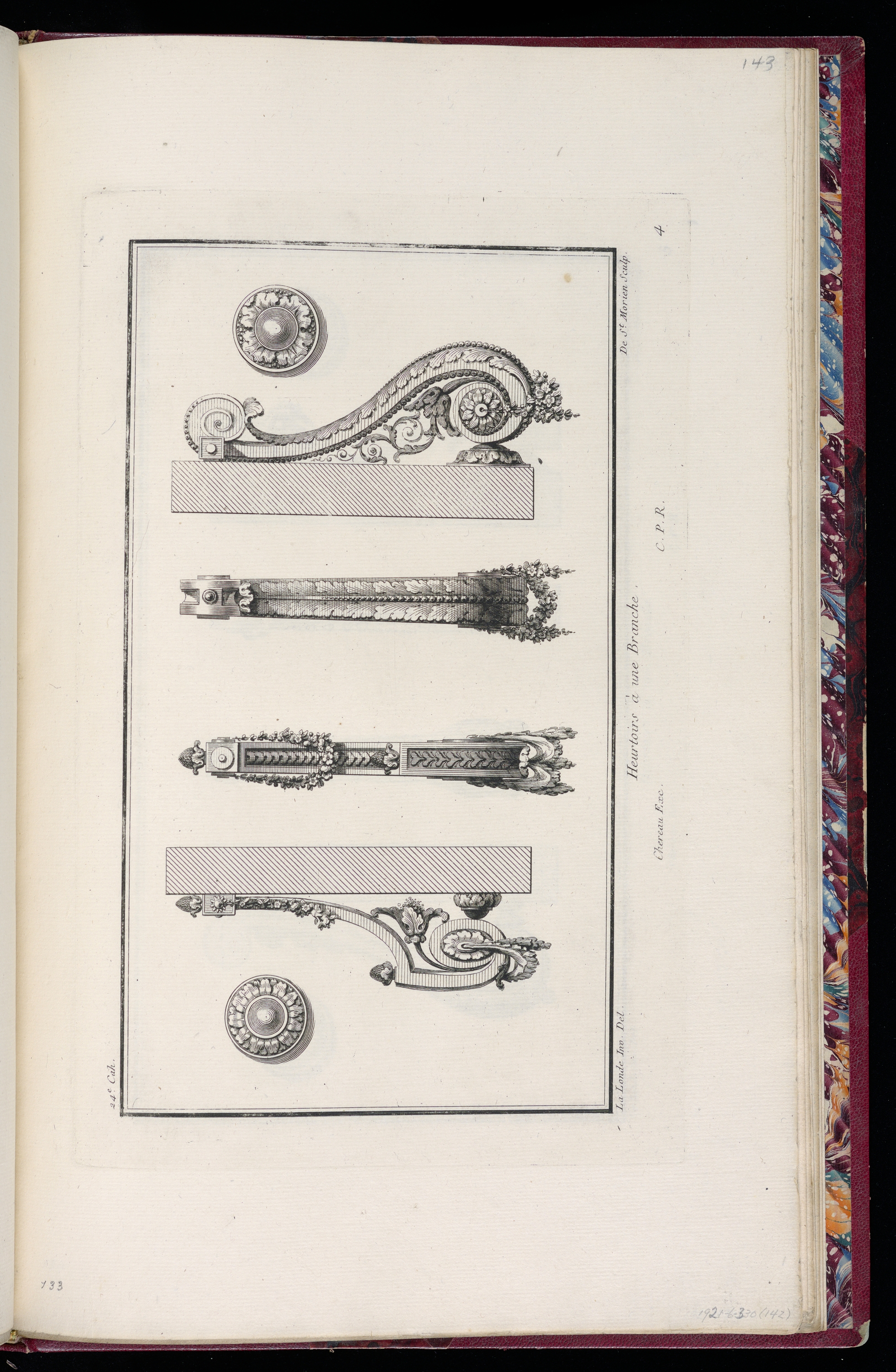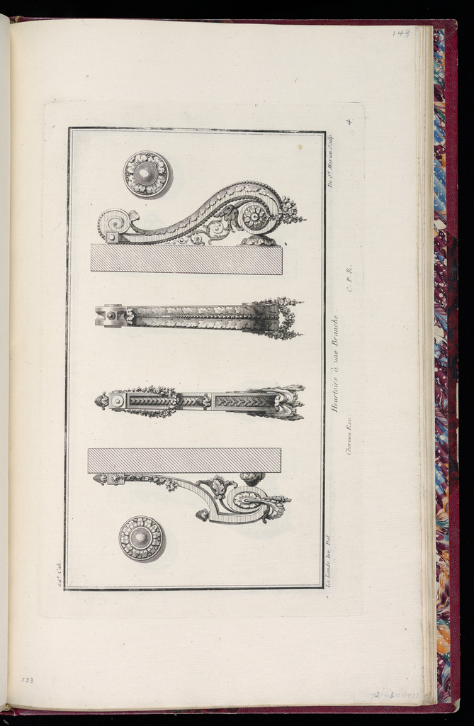Printed upper left, in plate: 24e. Cah.; Printed lower right, in plate: 4; Printed lower center, in plate: Heurtoirs à une Branche . / Chereau Exc. C.P.R.; Inscribed in graphite, upper right, in margin: 143; Inscribed in graphite, lower right, in margin: 1921-6-330(142); Inscribed in graphite, lower left, in margin: 133