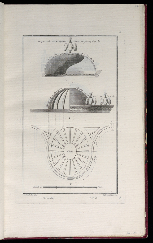Printed upper center, in plate: Impériale en Coupole avec un fond Ovale.; Printed upper right, in plate: B; Printed center, in plate: Coupe sur la Ligne A. B.; Printed center left, in plate: Elévation de la Menuiserie; Printed center right, in plate: Elévation extérieure avec la Corniche.; Printed lower center, in plate: Chereau Exc. C.P.R.; Printed lower right, in plate: 5; Inscribed in graphite, upper right, in margin: 12; Inscribed in graphite, lower left, in margin: 11; Inscribed in graphite, lower right, in margin: 1921-6-331(12)