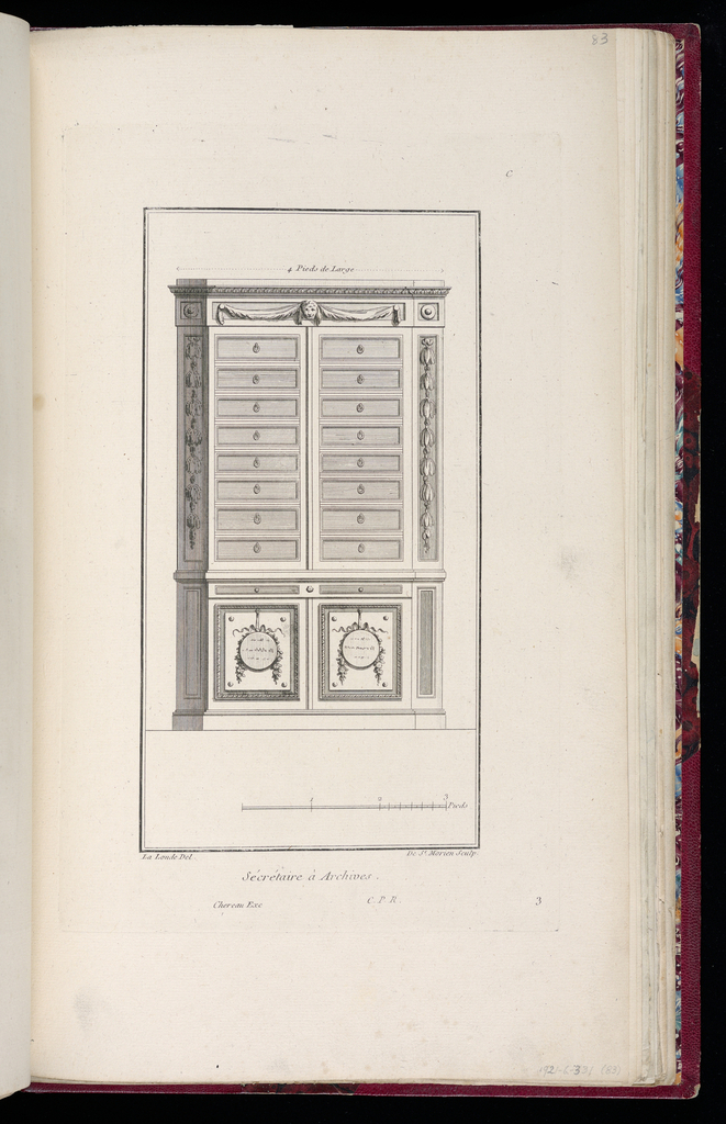 Print, Sécrétaire à Archives; Designed by Richard de Lalonde (French, active 1780–96); Print Maker: Mathieu Nicolas Goulet de Saint-Morien (French, active late 18th c.); Published by Jacques-François Chéreau (French, 1742 - 1794); France; etching on off-white laid paper; Purchased for the Museum by the Advisory Council; 1921-6-331-83