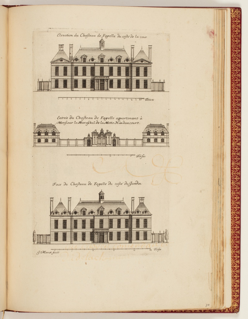 <ref name=CH>{{cite web |url=https://www-6.collection.cooperhewitt.org/objects/18260129/ |title=Print, Elevation du Chasteau de Fayelle du costé de la cour / Entrée du Chasteau de Fayelle appartenant à Monsieur le Mareschal de la Motte Haudancourt / Face du Chasteau de Fayelle du costé du Jardin |author=Cooper Hewitt, Smithsonian Design Museum |accessdate=19 December 2025 |publisher=Smithsonian Institution}}</ref>