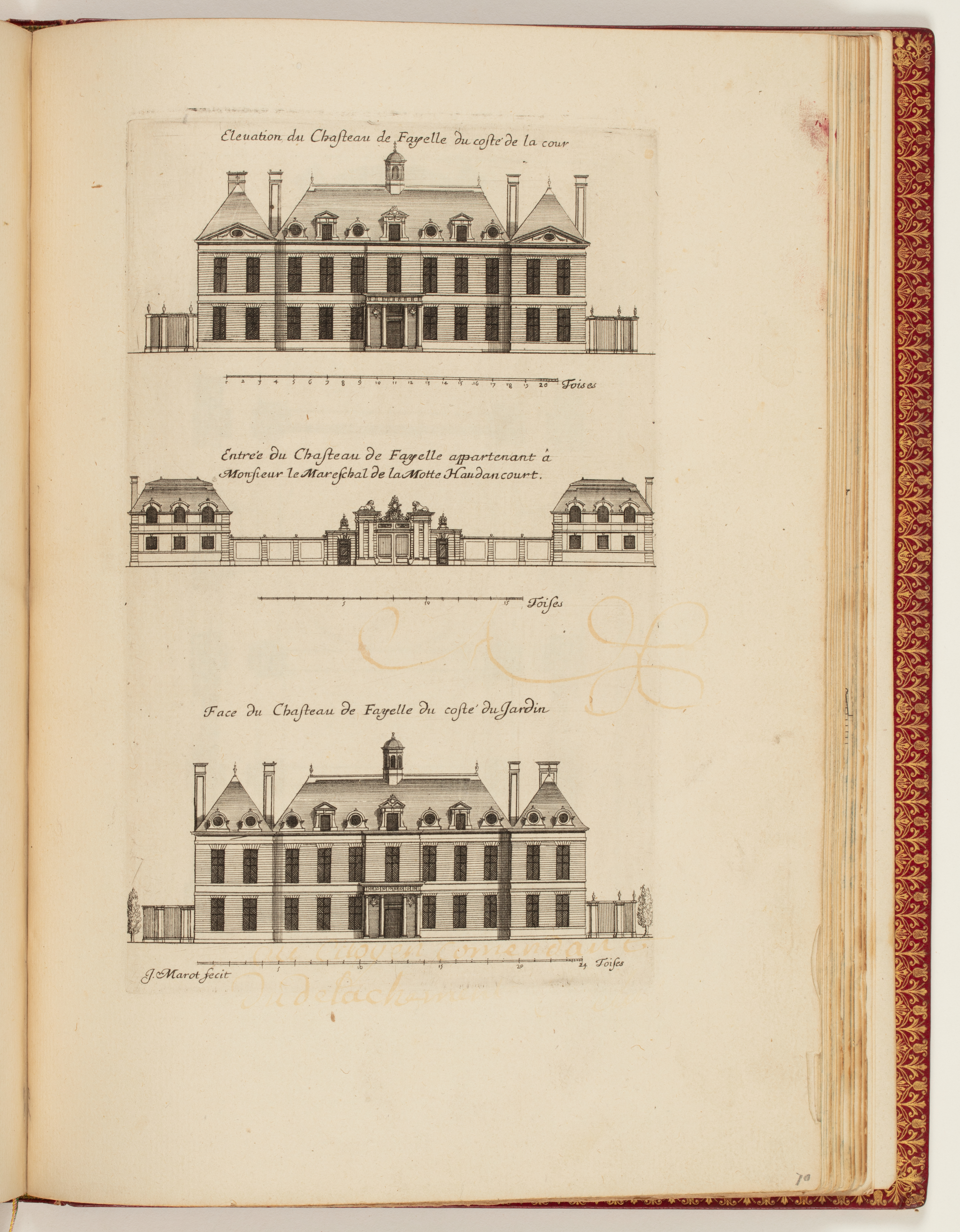 Lettered in plate, upper center: Elevation du Chasteau de Fayelle du costé de la cour; lettered center right: Toises; lettered center: Entrée du Chasteau de Fayelle appartenant à/ Monsieur le Mareschal de la Motte Haudancourt.; lettered center right: Toises; lettered lower center: Face du Chasteau de Fayelle du costé du Jardin; inscribed in red ink lower center: au [---]oyen comendant/ du detachemant; lettered lower right: Toises