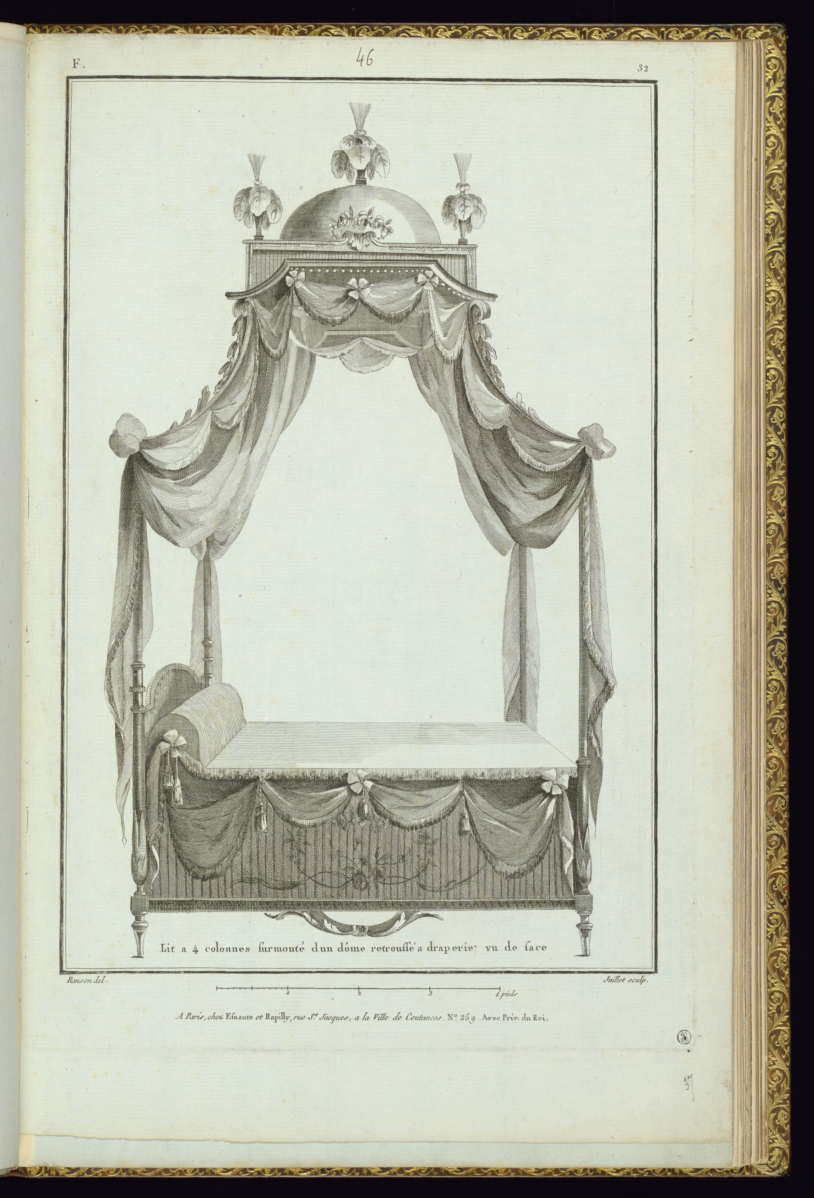 Lettered in plate, upper left: F; inscribed in ink, upper center margin: 46; numbered in plate, upper right: 32; inscribed in graphite lower right, below plate: 37; lettered in plate, lower center: Lit a 4 colonnes surmonté d’un dôme retroussé a draperie vu de face