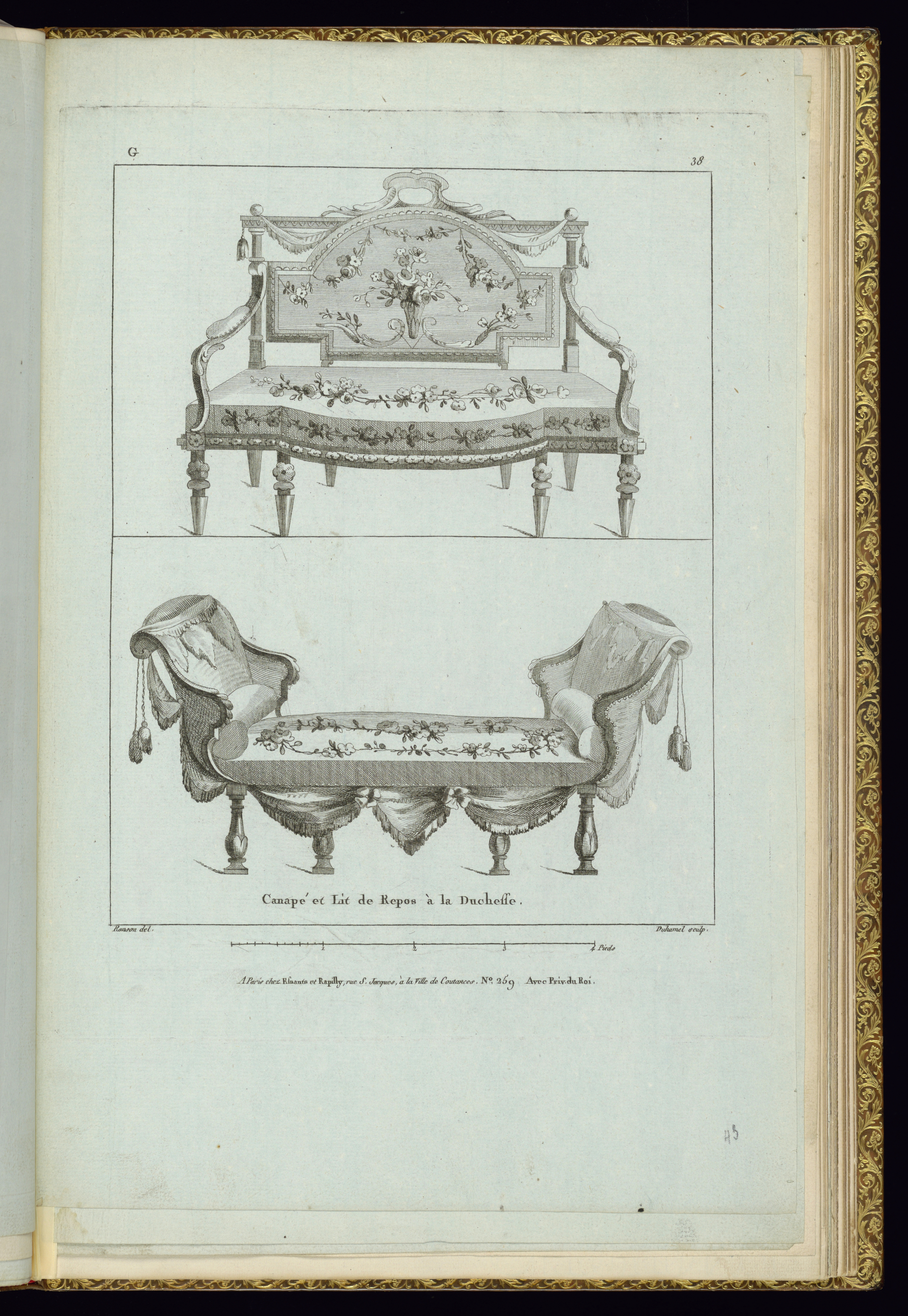 Lettered in plate, upper left: G; numbered in plate upper right: 38; inscribed in graphite lower right margin: 43; lettered in plate lower center: Canapé et Lit de Repos à la Duchesse