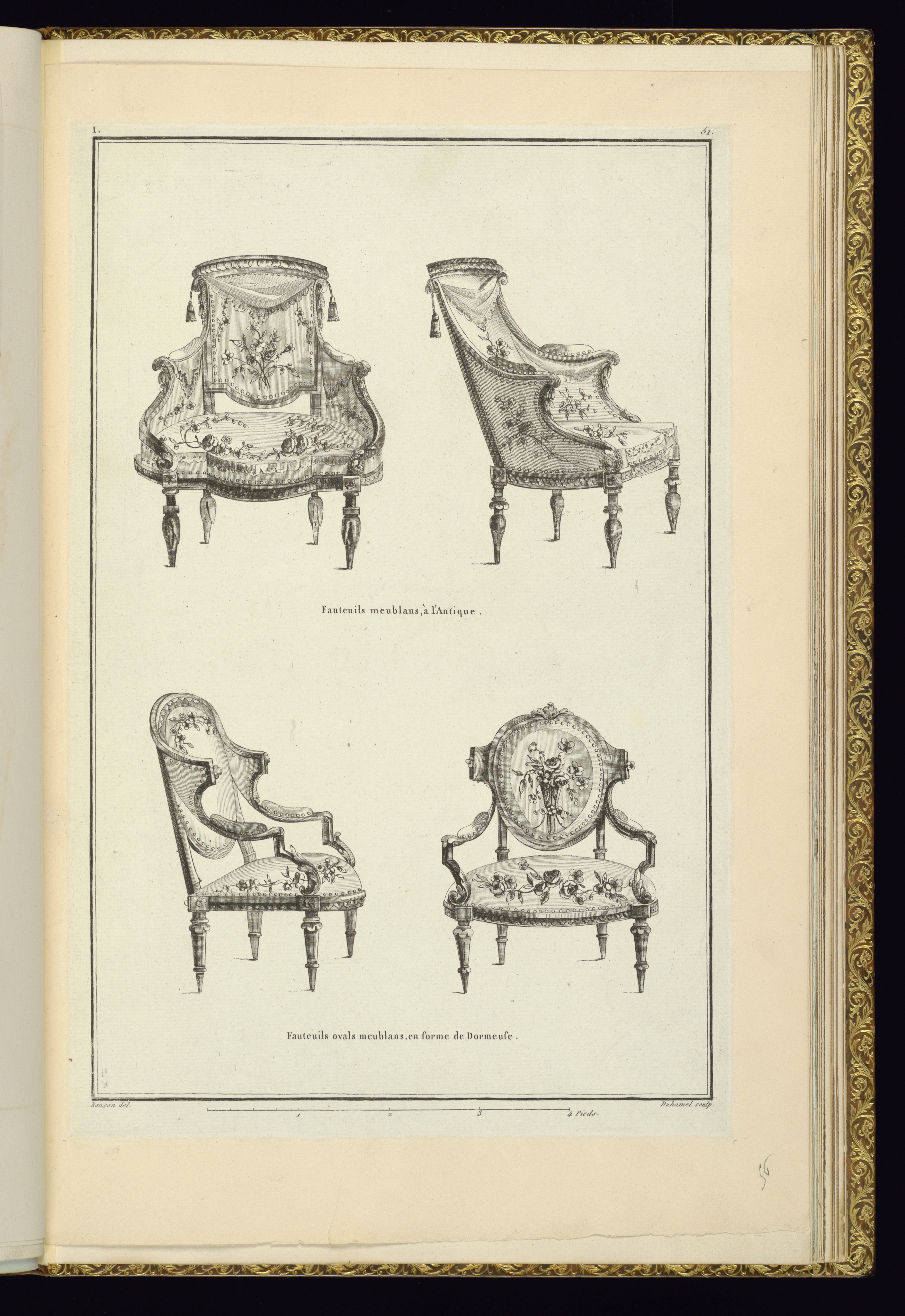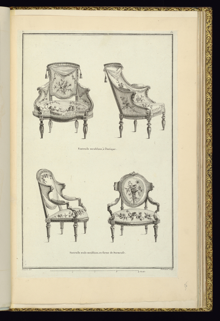 Lettered in plate, upper left: I; numbered in plate upper right: 51; inscribed in graphite lower right margin: 56; lettered in plate lower center: Fauteuils ovals meublans, en forme de Dormeuse