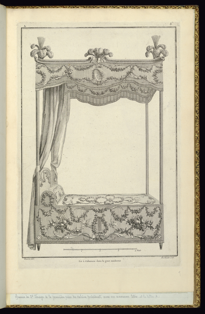 Lettered in plate, upper left: A; numbered in plate, upper right: No. 6; inscribed in graphite, lower right margin: 7; lettered in plate, lower center: Lit à Colonnes dans le gout moderne