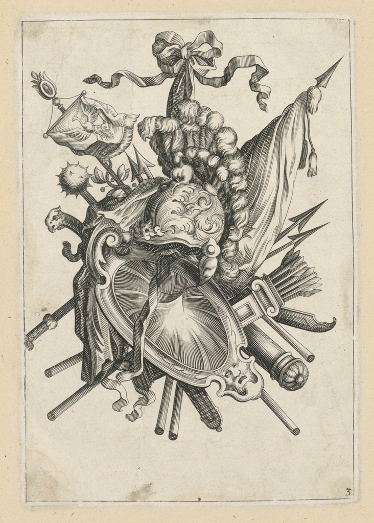 Print, Plate 3 from a Set of Trophies of Weapons; Print Maker: Johann Ulrich Stapff (German, active 17th century); Germany; engraving on paper; 16.7 × 11.4 cm (6 9/16 × 4 1/2 in.); Purchased for the Museum by the Advisory Council; 1921-6-40-3