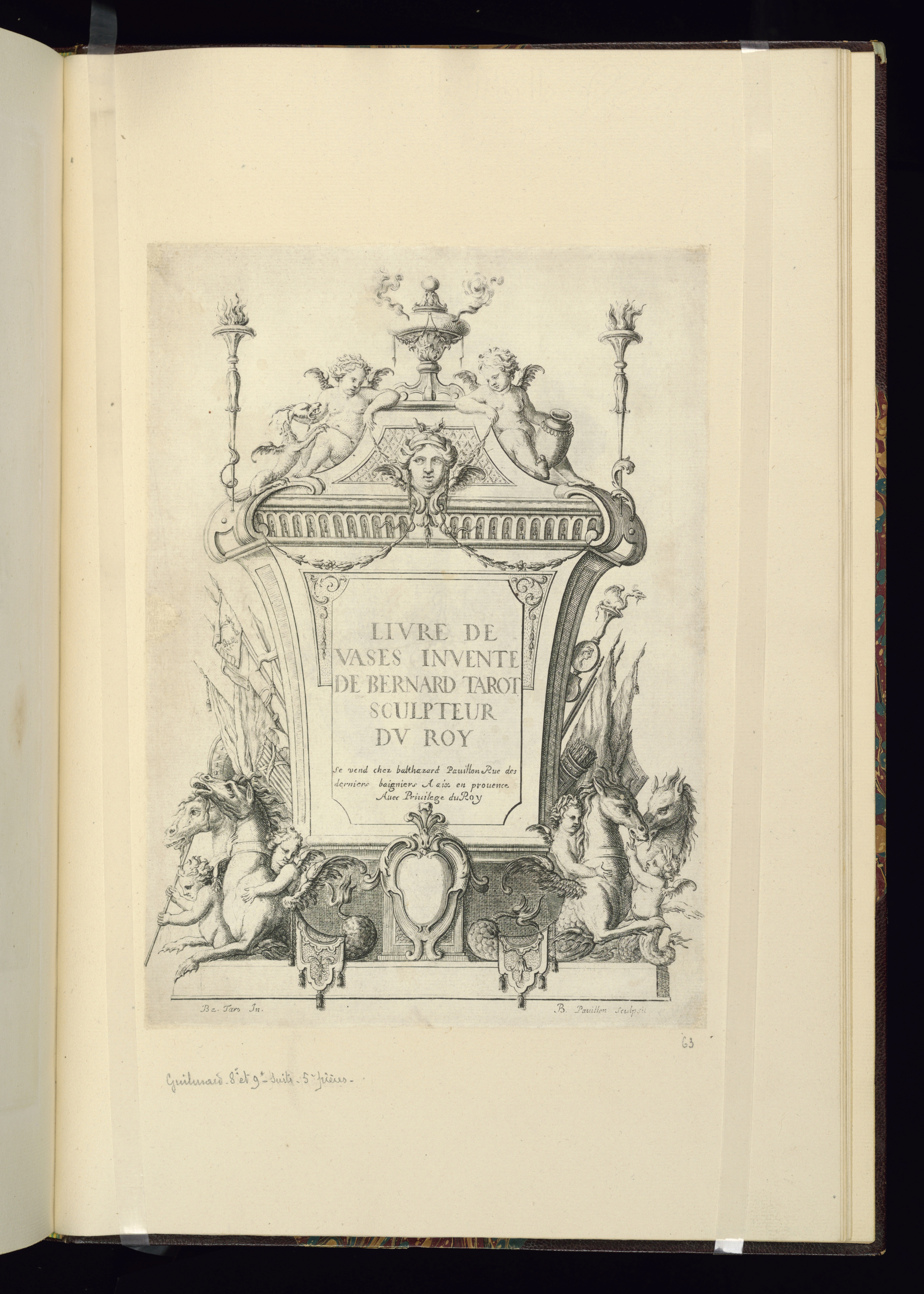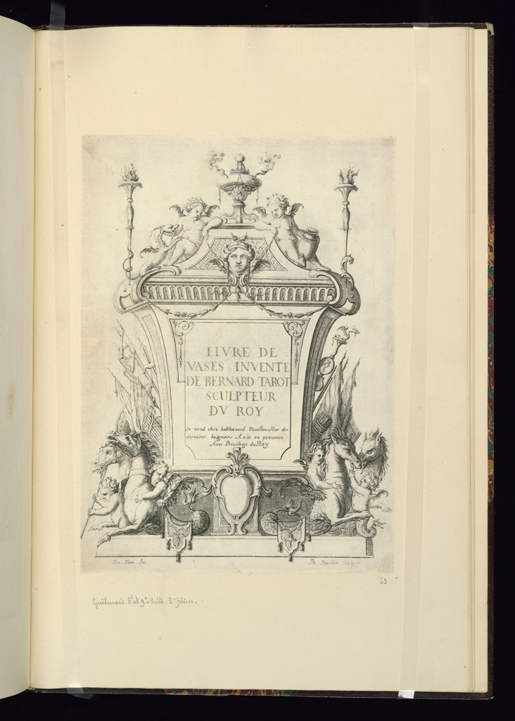 LIVRE DE/ VASES INVENTE/ DE BERNARD TAROT/ SCULPTEUR/ DU ROY; inscribed in graphite, below plate, lower right: 63; inscribed in graphite, below plate, lower left: Guilmard 8e et 9e Suite 5 pièces.