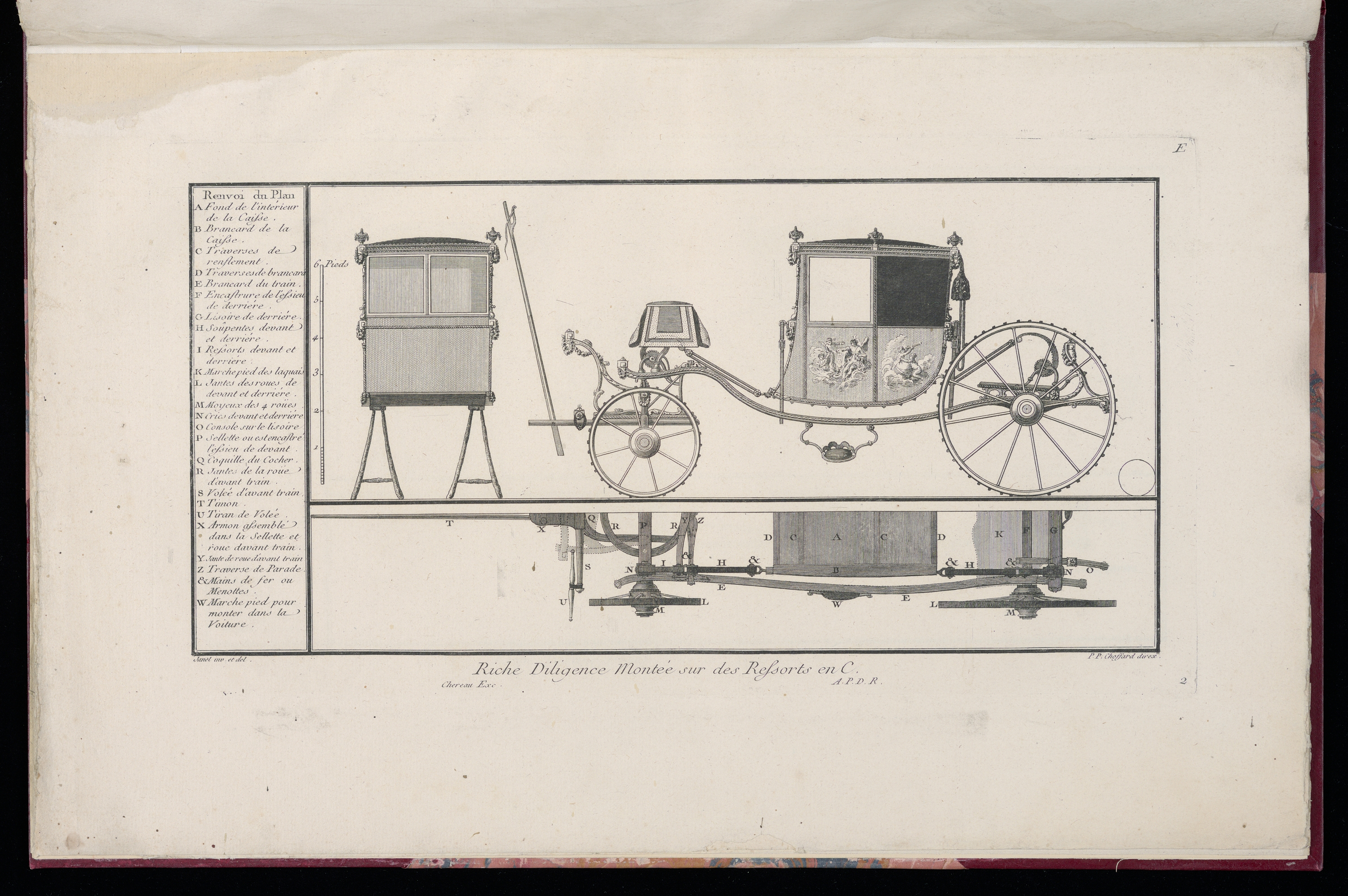 Lettered upper right, in plate: E; Lettered lower center, in plate: Riche Diligence montée sur des Ressorts en C. / Chereau Exc. [...] A.P.D.R.; Lettered lower right, in plate: 2