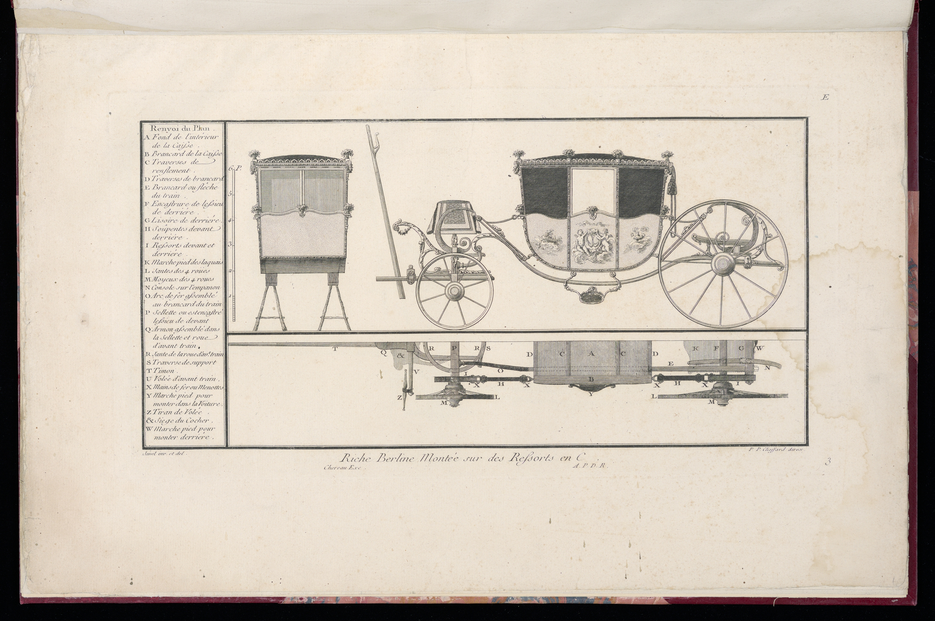 Lettered upper right, in plate: E; Lettered lower center, in plate: Riche Berline montée sur des Ressorts en C. / Chereau Exc. [...] A.P.D.R.; Lettered lower right, in plate: 3