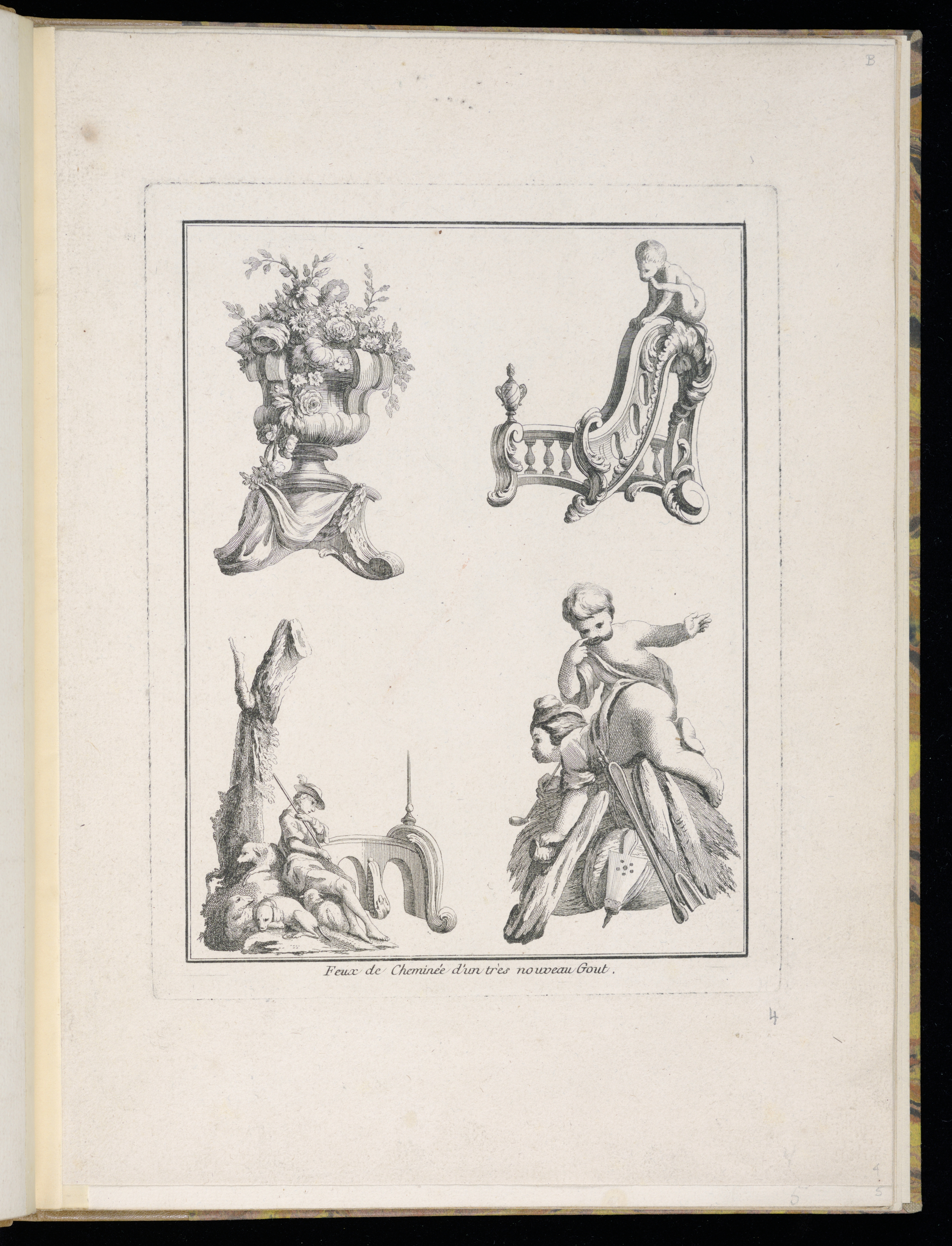 Inscribed in graphite upper right margin: B; inscribed in graphite below plate, lower right: 4; inscribed in graphite lower right margin:4; lettered in plate lower center: Feux de Cheminée d’un très nouveau Gout