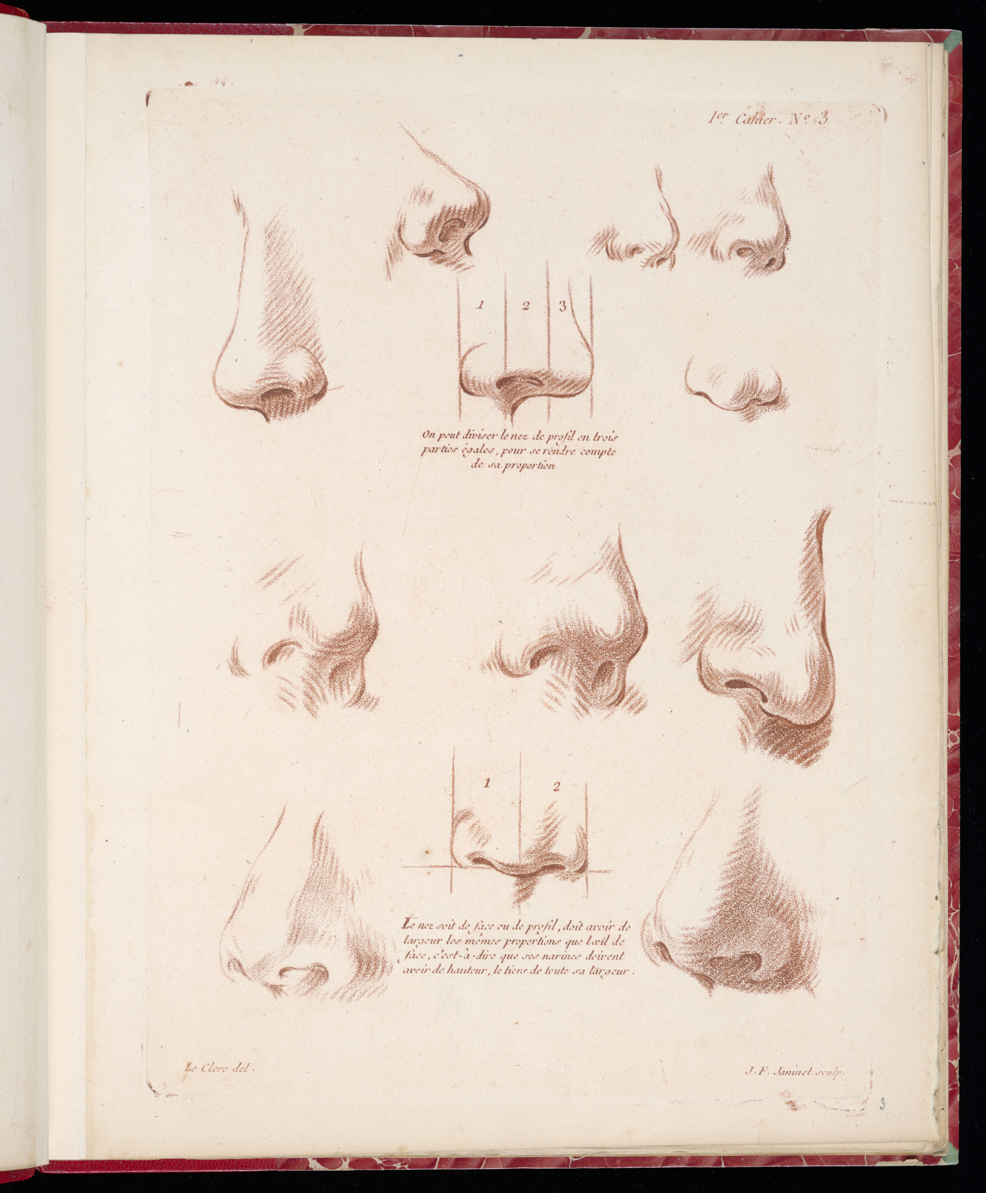 Lettered upper right, in plate: Ier Cahier No. 3; inscribed in graphite lower right margin: 3; lettered lower center, in plate: Le nez soit de face ou de profil, doit avoir de/ largeur les mêmes proportions que loeil de/ face, c’est-à-dire que ses narines doivent/ avoir de hauteur, le tiens de toute sa largeur; lettered center, in plate: On peut diviser le nez de profile en trois/ parties égales, pour se rendre compte/ de sa proportion