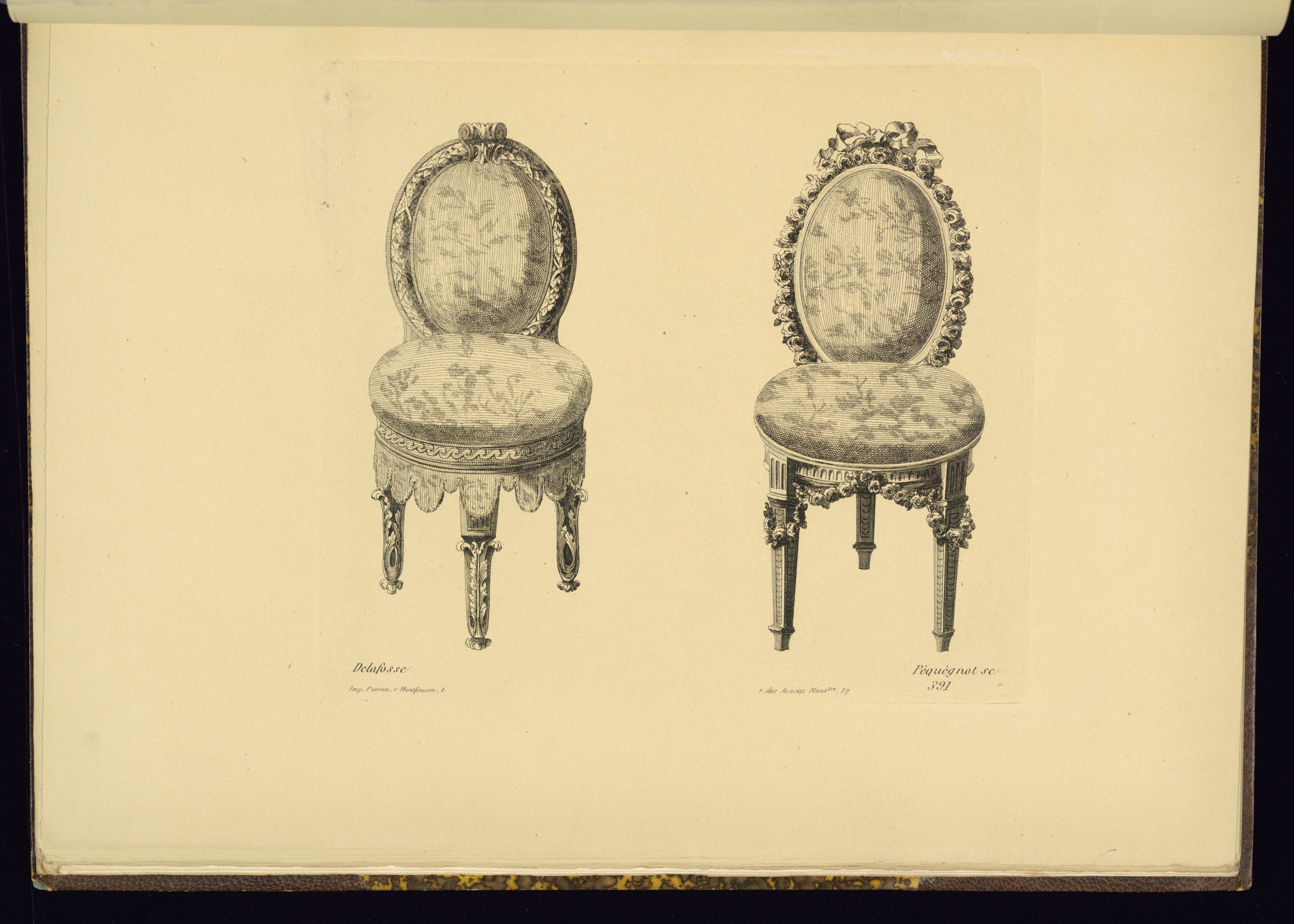 Print, Two Chair Designs; Designed by Jean-Charles Delafosse (French, 1734–1791); Printed by Pierron (French, active 1849 – 1866); Print Maker: Auguste Péquégnot (French, 1819 – 1878); France; etching on paper; Purchased for the Museum by the Advisory Council; 1921-6-456-28