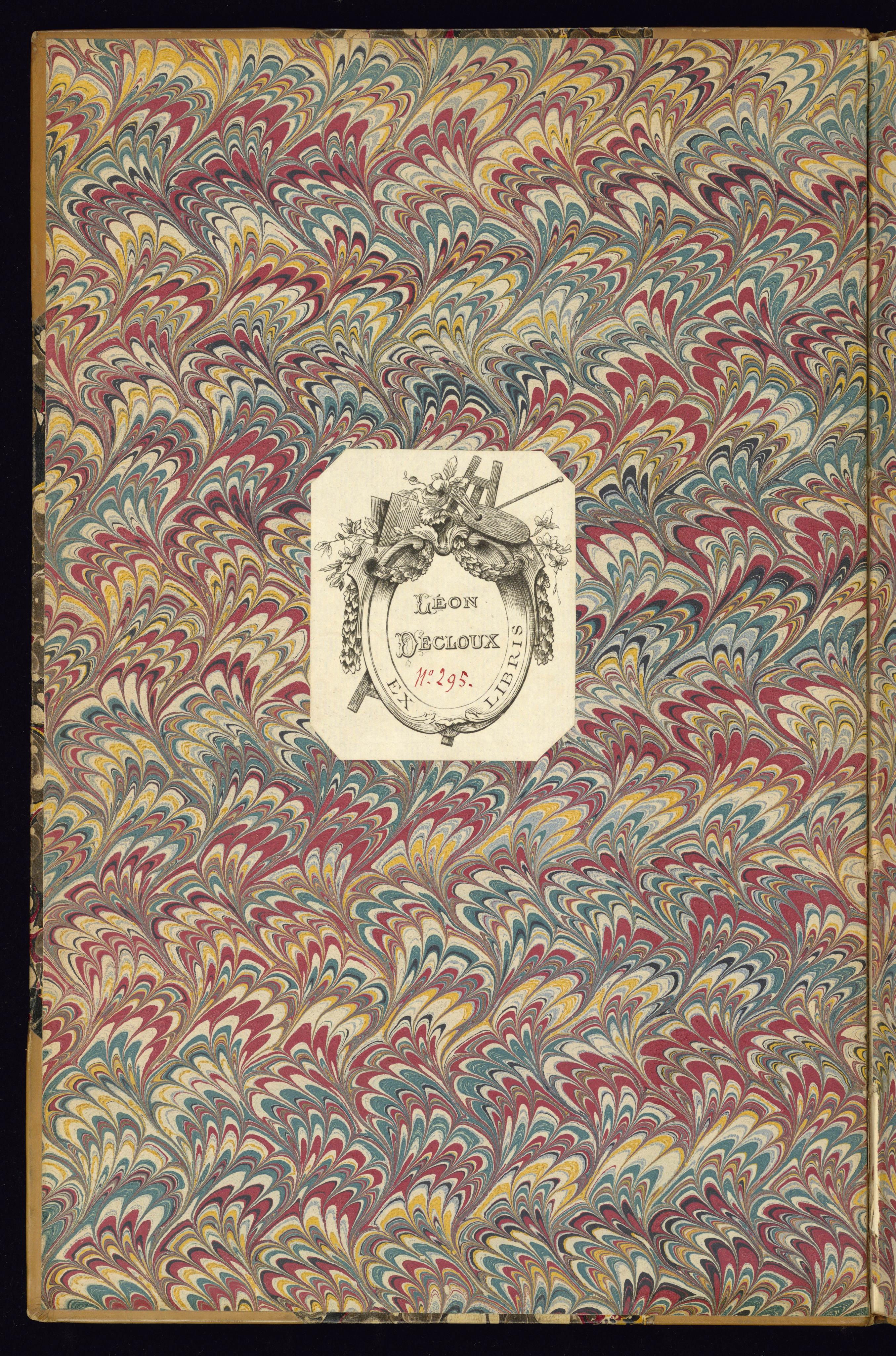 Léon Decloux ex-libris pasted onto center of upper cover pastedown; inscribed in red ink in center of Léon Decloux Ex Libris: No. 295