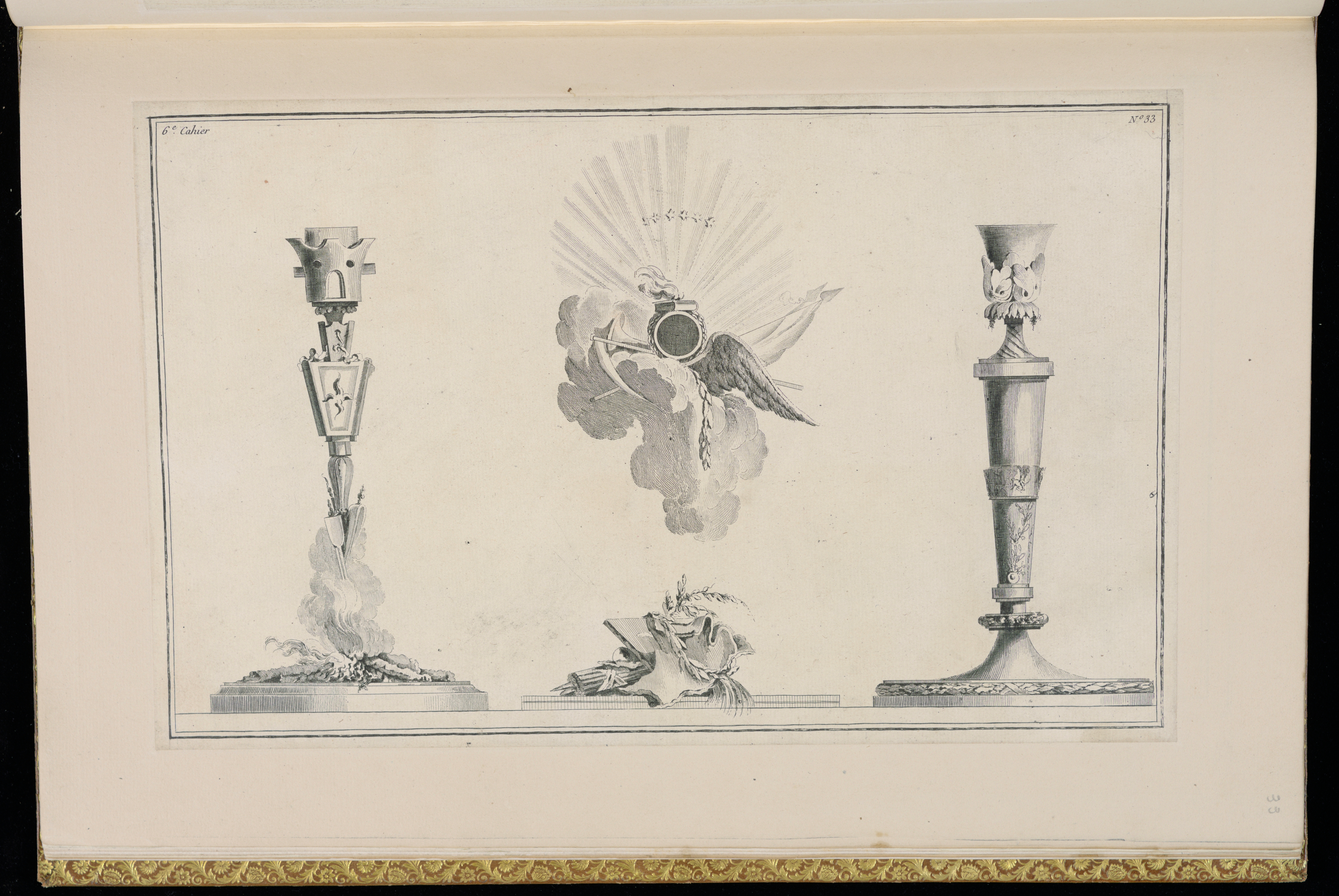 Print, Designs for Candlesticks, Cartel Clock Case, and a Trophy; Designed by Henri Sallembier (French, ca. 1753 - 1820); Print Maker: Jacques Juillet (French, 1739 - 1784); Published by Émilie-Louise Avaulez (French, active 1777 – 1779); France; etching on paper; Purchased for the Museum by the Advisory Council; 1921-6-482-33