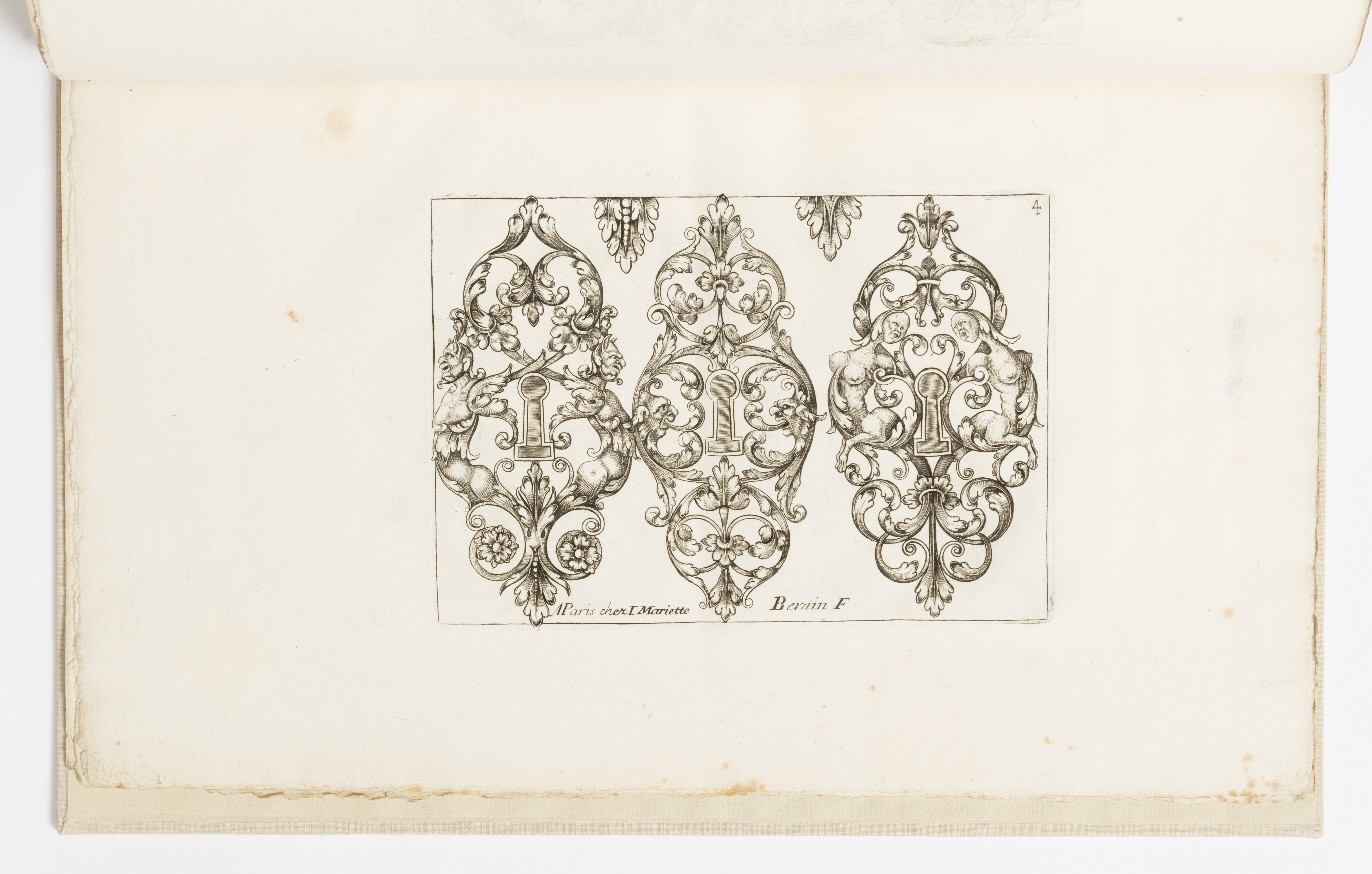 Print, Plate 4, from Diverses pièces de serruriers (Various Designs for Locksmiths); Designed by Hugues Brisville (French, active ca. 1663); Engraved by Jean Bérain the Elder (French, 1640–1711); Published by Pierre Mariette II (French, 1634 - 1716); France; engraving on laid paper; H x W: 33.5 × 20.2 cm (13 3/16 × 7 15/16 in.) Platemark: 16.7 × 11.5 cm (6 9/16 × 4 1/2 in.); Purchased for the Museum by the Advisory Council; 1921-6-486-5