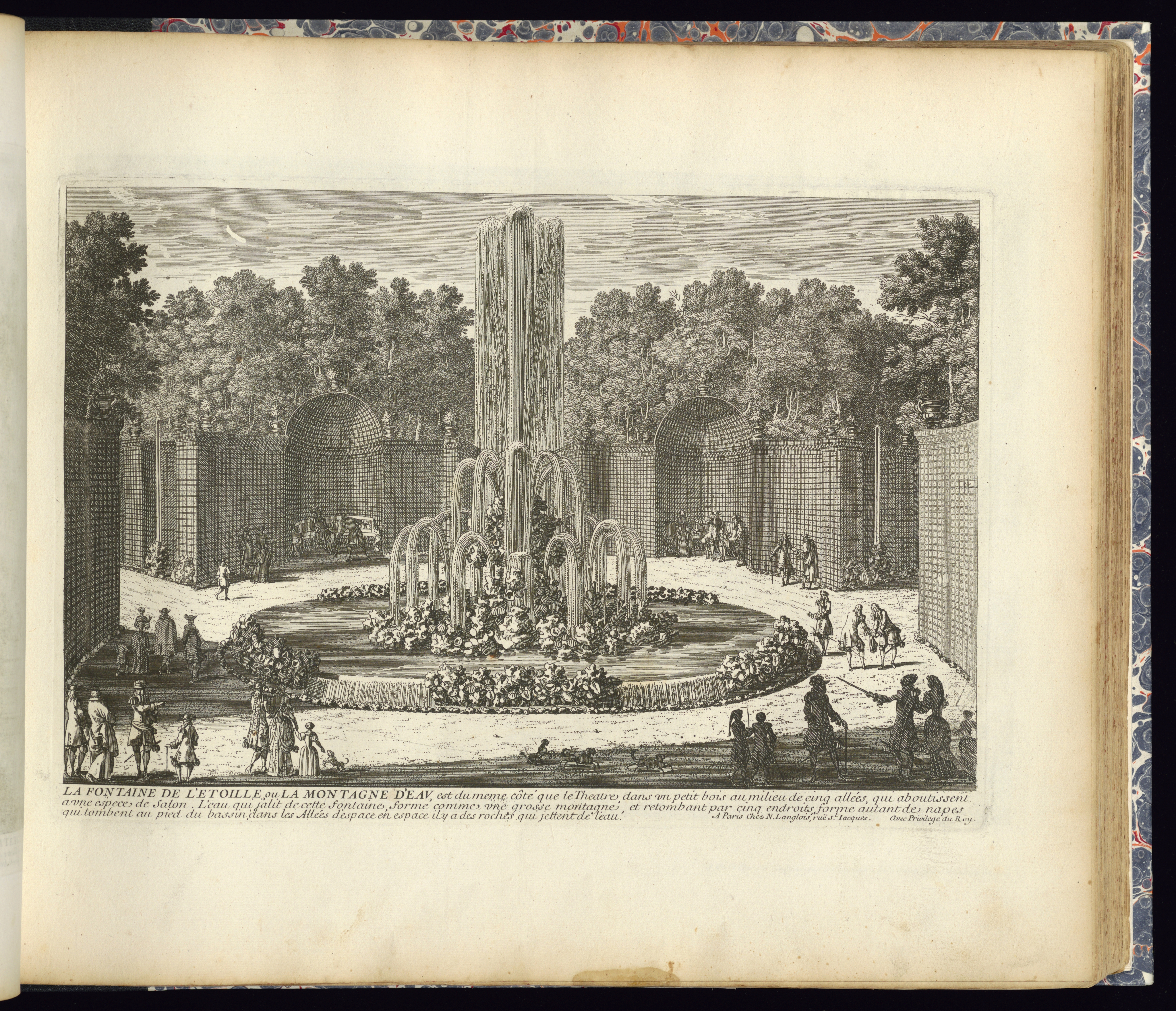 Lettered in plate, lower center: LE FONTAINE DE L’ETOILLE ou LA MONTAGNE D’EAU est du meme côté que le Theatre dans un petit bois au milieu de cinq allées, qui aboutissent/ a une espece de Salon. L’eau qui jalit de cette fontaine formé comme une grosse montagne et retombant par cinq endroits forme autant de napes/ qui tombent au pied du basin dans les Allées d’espace en espace il y a des roches qui jettent de l’eau.