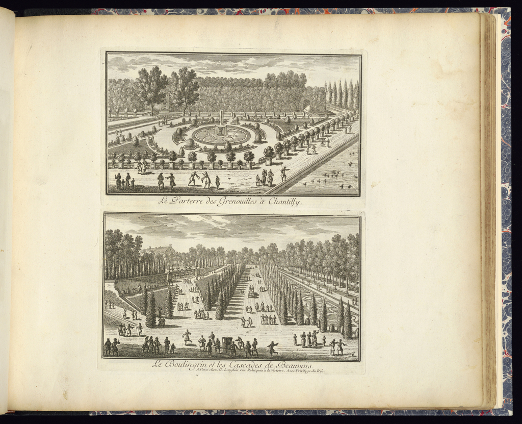 Upper plate, lettered in plate, lower center: Le Parterre des Grenoüilles à Chantilly; Lower plate, lettered in plate, lower center: Le Boulingrin et les Cascades de Beauvais