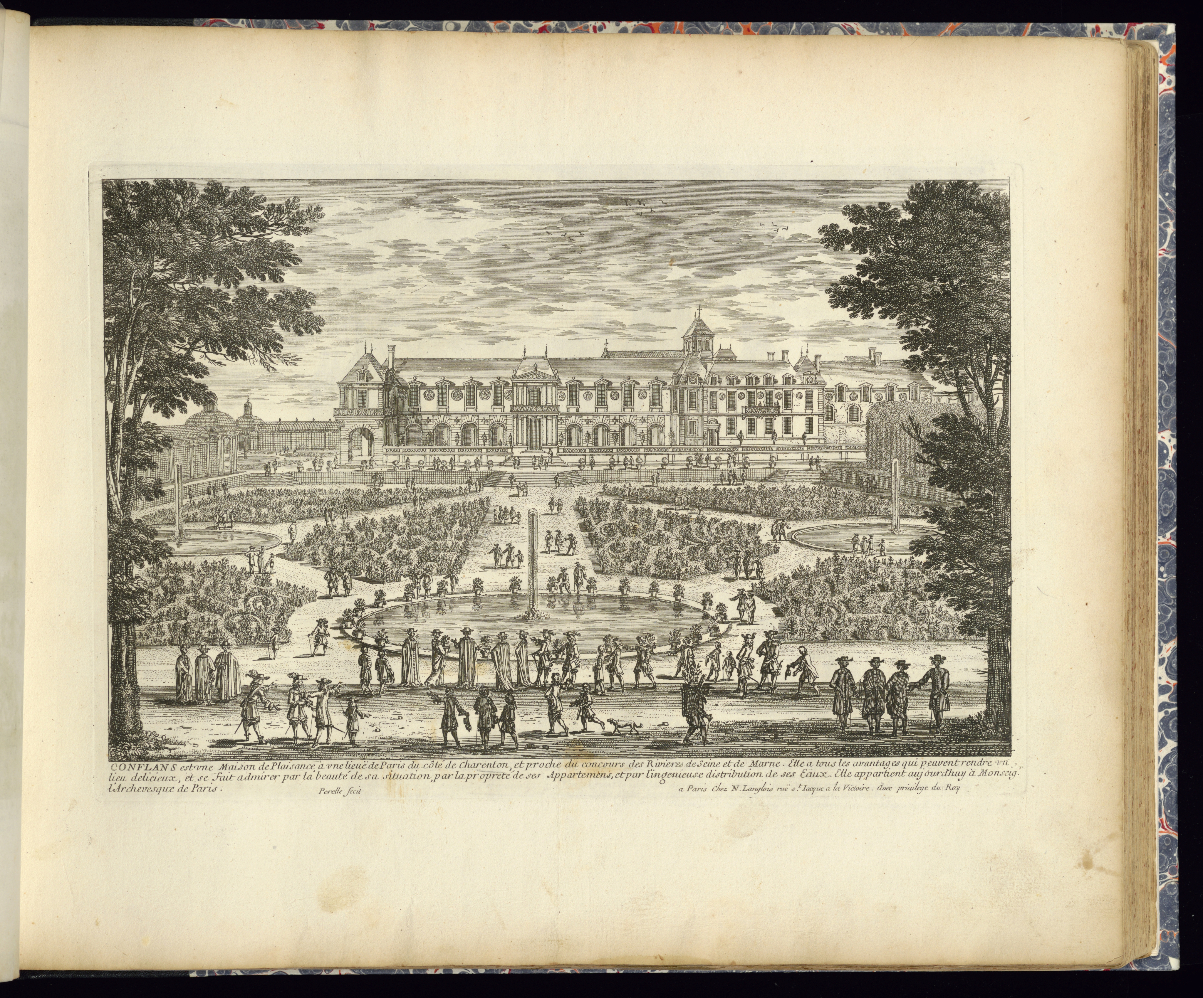 Lettered in plate, lower center: CONFLANS est une Maison de Plaisance à une lieuë de Paris du côté de Charenton, et proche du concours des Riveres de Seine et de Marne. Elle a tous les avantages qui peuvent rendre un/ lieu delicieux, et se fait admirer par la beauté de sa situation par la propreté de ses Appartemens et par l’ingenieuse distribution de ses Eaux. Elle apprtient aujourd’huy à Monseig/ l’Archevesque de Paris.