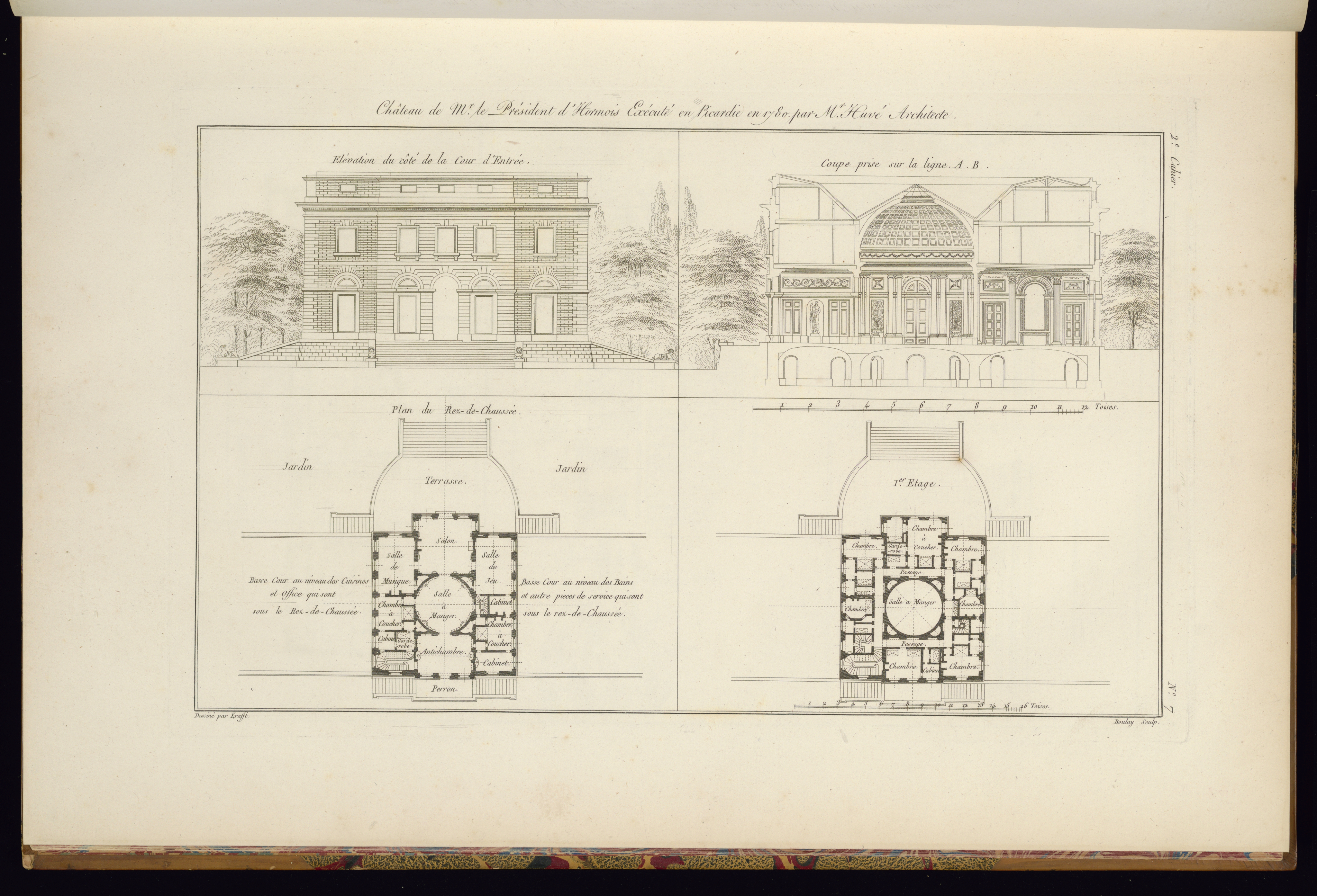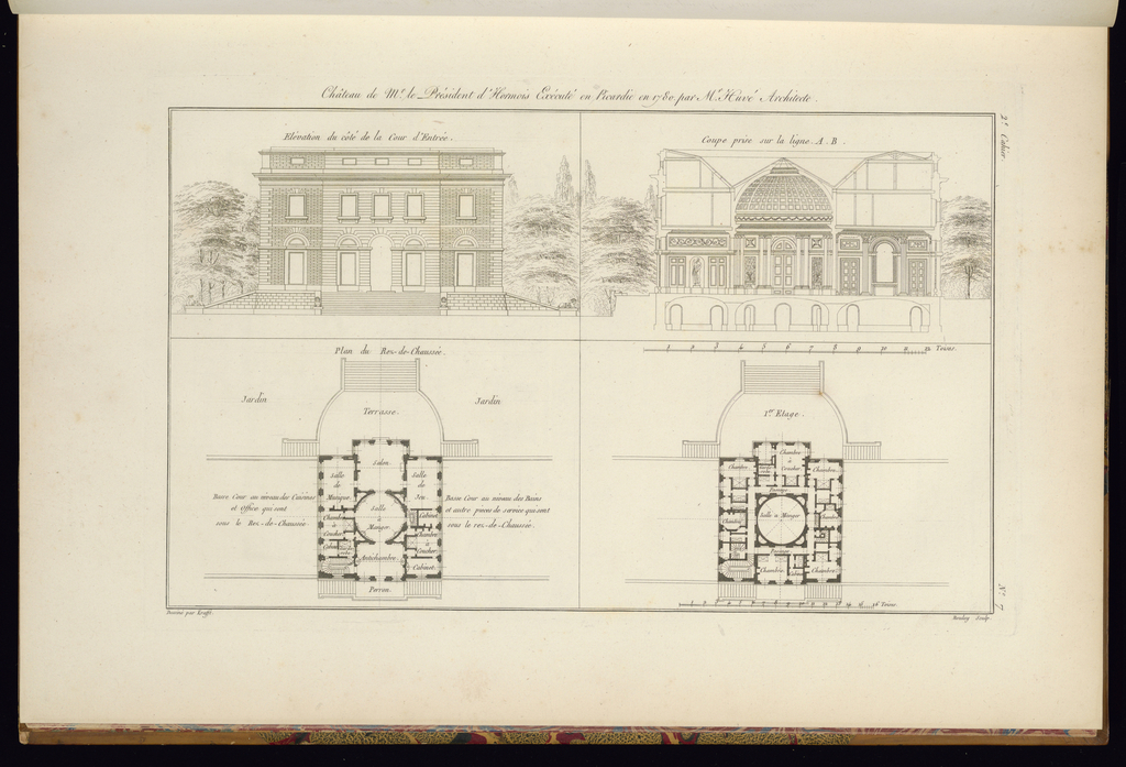 Lettered in plate, upper center: Château de Mr. le Président d’Hormois Exécuté en Picardie en 1780 par Mr. Huvé Architecte.; lettered upper left: Elévation du côté de la Cour d’Entrée; lettered upper right: Coupe prise sur la ligne A. B. / 2e Cahier; lettered lower left: Plan du Rez-de-Chaussée/ Jardin/ Terasse/ Jardin/ Basse Cour au niveau des Cuisines/ et Office qui sont/ sous le Rez-de-Chaussée/ Basse Cour au niveau des Bains/ et autre pieces de service qui sont/ sous le rez-de-Chaussée; lettered lower right: 1er Etage; numbered lower right: No. 7