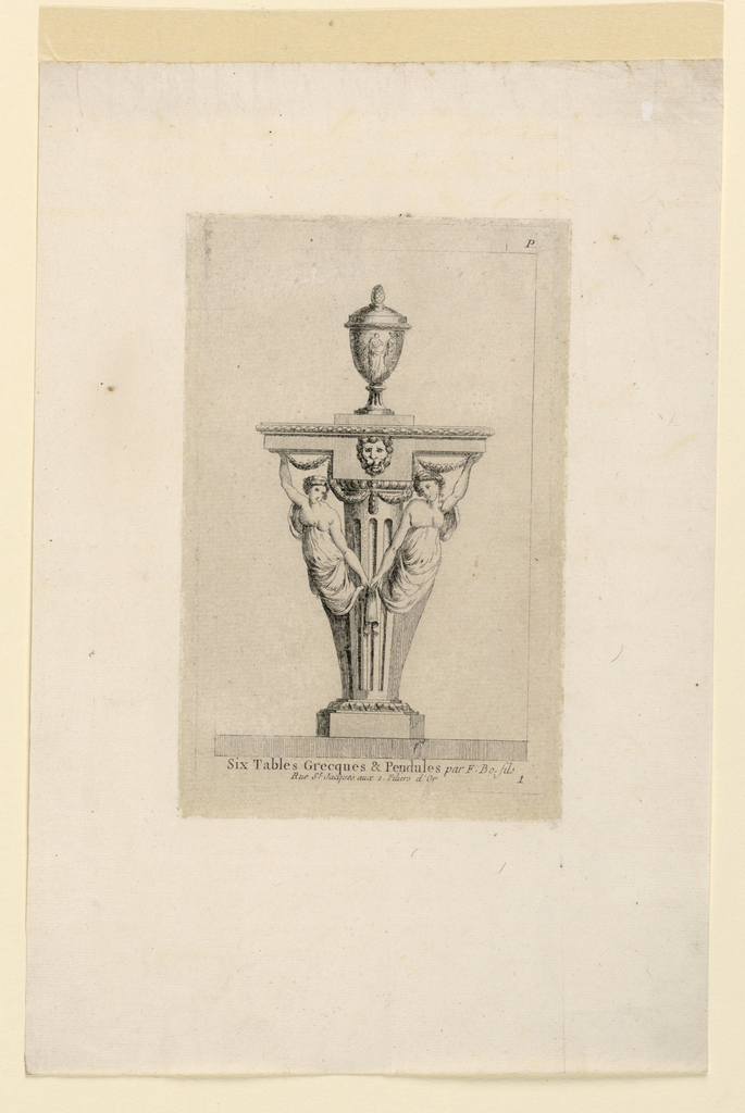 Print, Design for Table, Plate 1 from, "Six Tables Grecques & Pendules"; Print Maker: Jules-François Boucher le fils (French, 1736 – 1782); France; etching on paper; 16.7 × 10.3 cm (6 9/16 × 4 1/16 in.) ; Purchased for the Museum by the Advisory Council; 1921-6-75-1