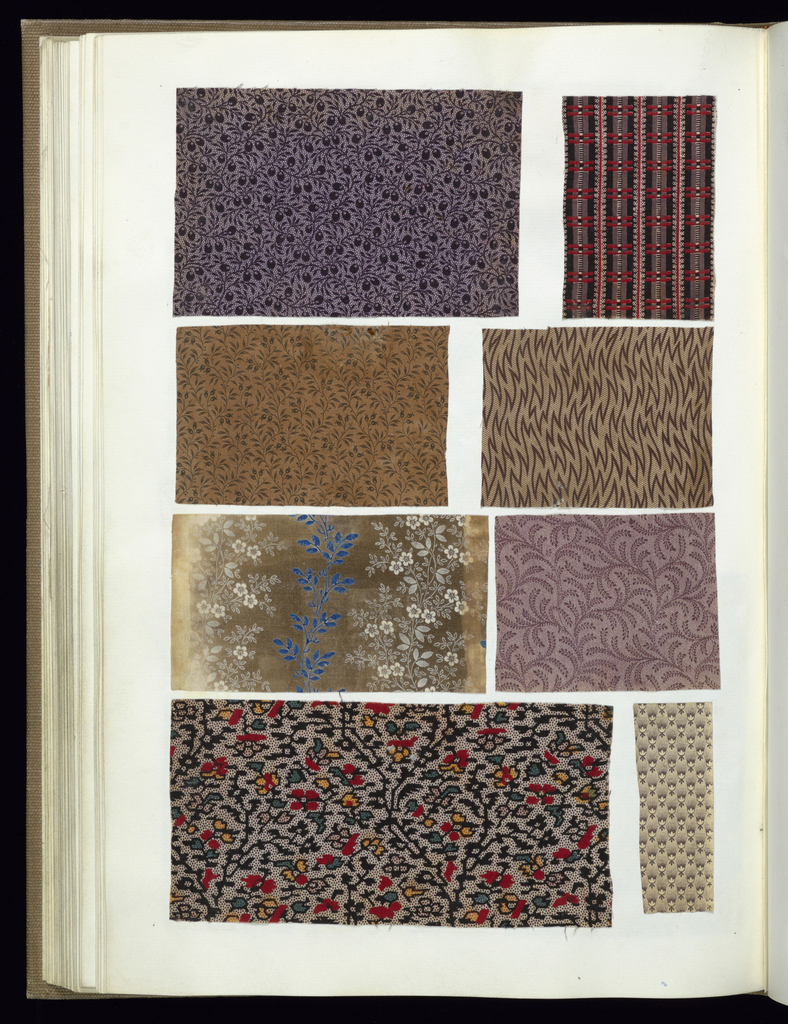 This is a Scrapbook of textile swatches. It is dated 1820–50 and we acquired it in 1921. Its medium is cardboard, leather, paper, cotton and its technique is printed. It is a part of the Textiles department.