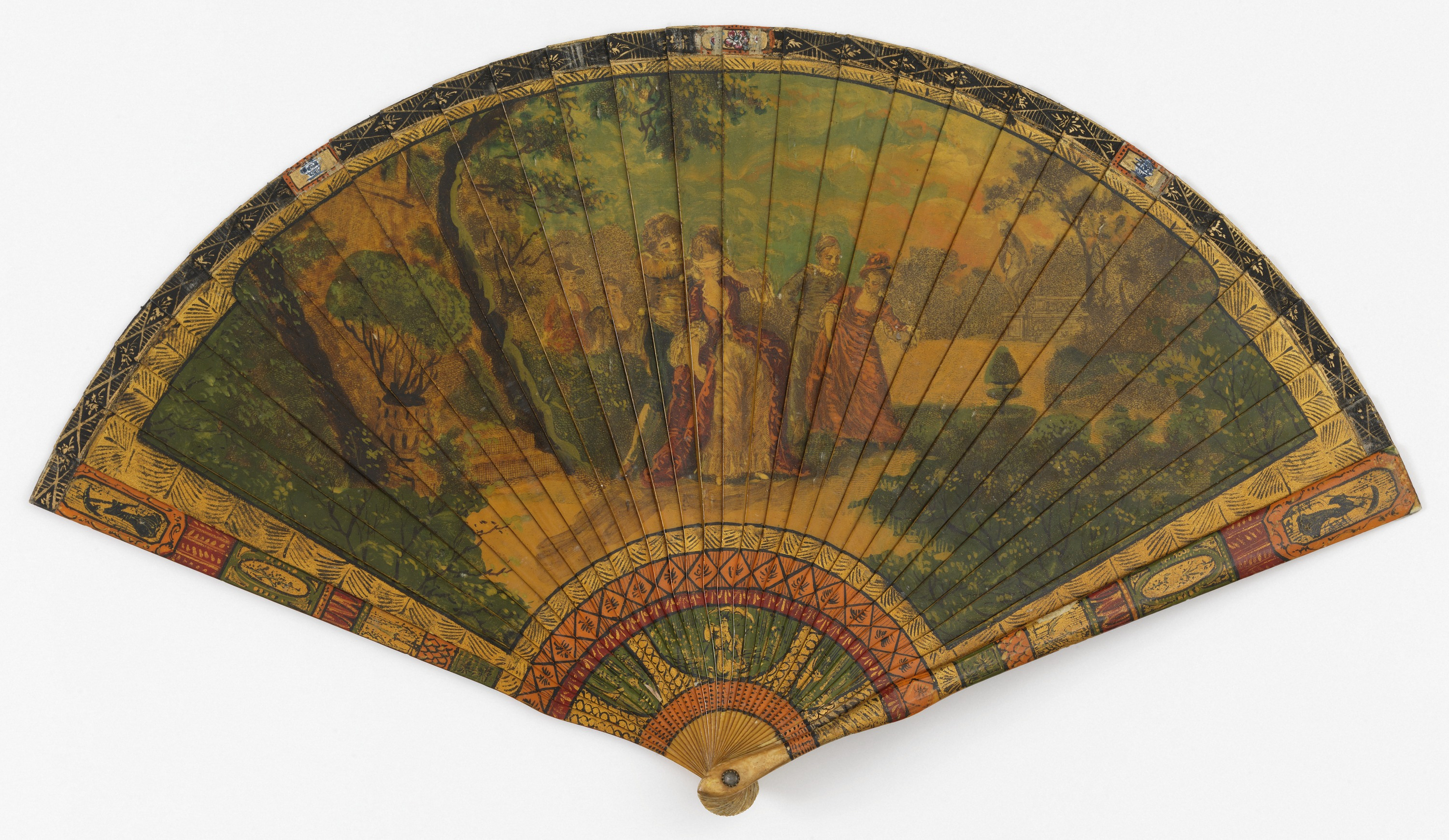 This is a Brisé fan. It is dated 1870–1879 and we acquired it in 1923. Its medium is painted and gilded ivory sticks with chromolithograph on paper. It is a part of the Textiles department.