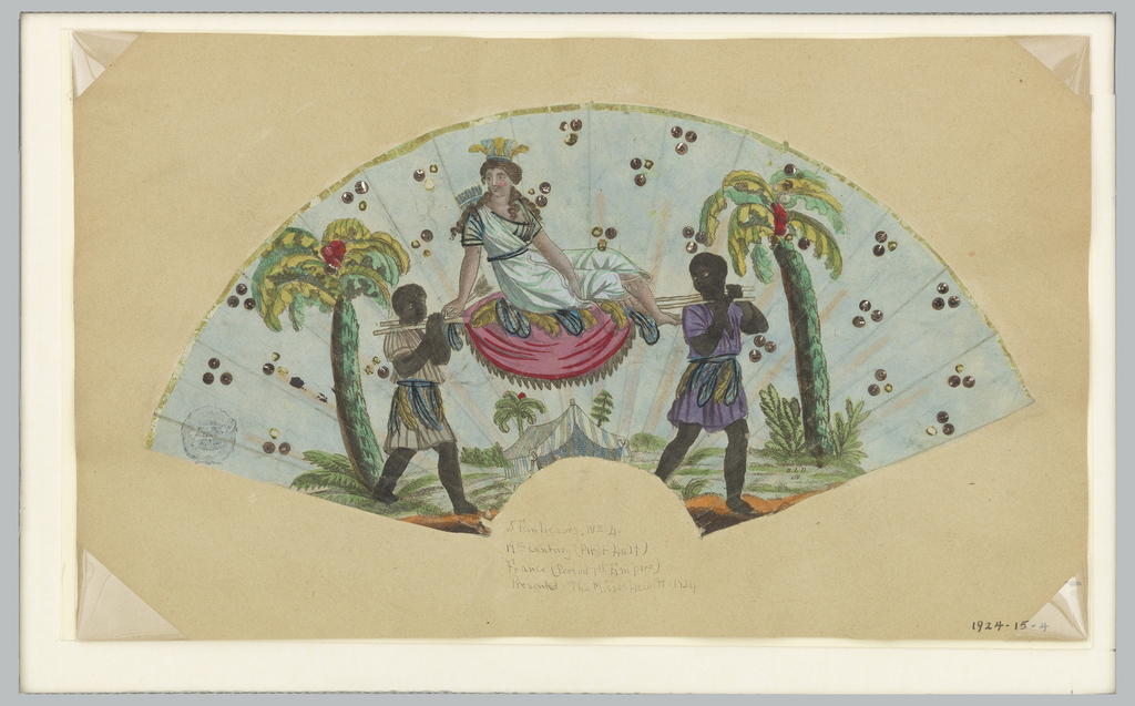 This is a Fan leaf. It is dated early 19th century and we acquired it in 1924. Its medium is paper leaf with hand-colored etching, sequins. It is a part of the Textiles department.