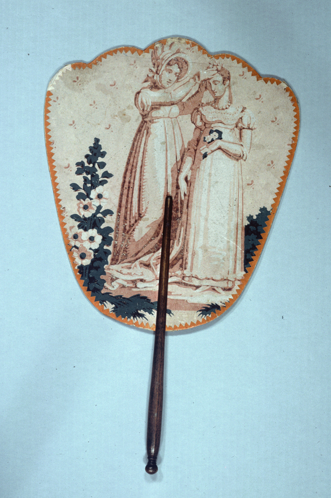 This is a Handscreen. It is dated late 18th–early 19th century and we acquired it in 1924. Its medium is painted paper leaf with cut-paper border, turned wood handle. It is a part of the Textiles department.