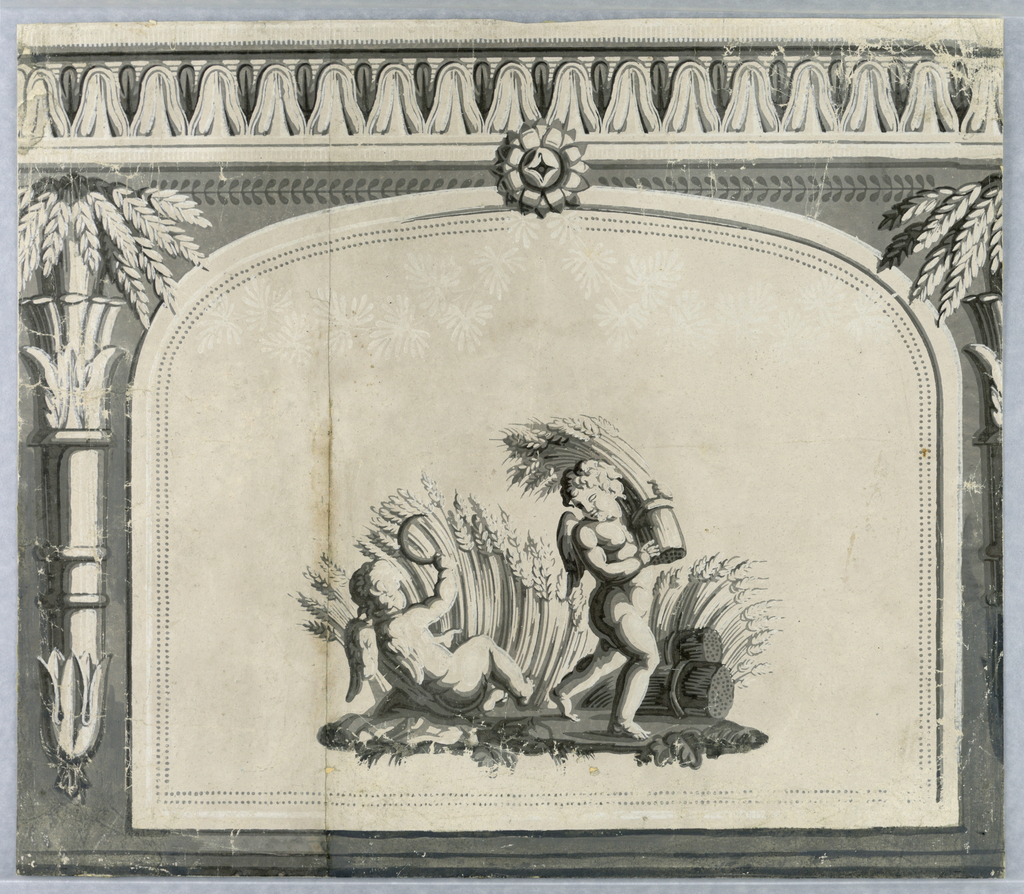 I came across this frieze paper and the image seemed a little unusual. The whole theme of the paper is wheat. Printed in grisaille, or shades of gray, this frieze is a trompe l’oeil design with a large inset panel as the main element. A wide architectural molding runs across the top edge, with a narrow band of laurel leaves below. On either side of the inset panel are vases or wall pockets containing bouquets of wheat ears. This of course ties in with the image printed on the inset panel, which shows two cherubs cutting and baling wheat. They seem to be enjoying themselves, as the one on the left is in a reclining position cutting down the wheat stalks with his scythe, while the standing cherub bales it and carries it off, wearing nothing but a smile. They’re both looking rather buff so perhaps they’ve been at it for a while!