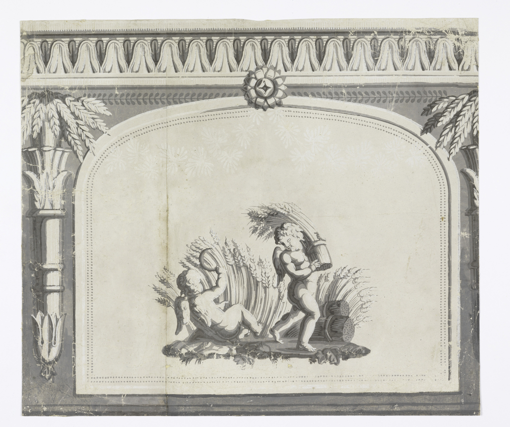 I came across this frieze paper and the image seemed a little unusual. The whole theme of the paper is wheat. Printed in grisaille, or shades of gray, this frieze is a trompe l’oeil design with a large inset panel as the main element. A wide architectural molding runs across the top edge, with a narrow band of laurel leaves below. On either side of the inset panel are vases or wall pockets containing bouquets of wheat ears. This of course ties in with the image printed on the inset panel, which shows two cherubs cutting and baling wheat. They seem to be enjoying themselves, as the one on the left is in a reclining position cutting down the wheat stalks with his scythe, while the standing cherub bales it and carries it off, wearing nothing but a smile. They’re both looking rather buff so perhaps they’ve been at it for a while!