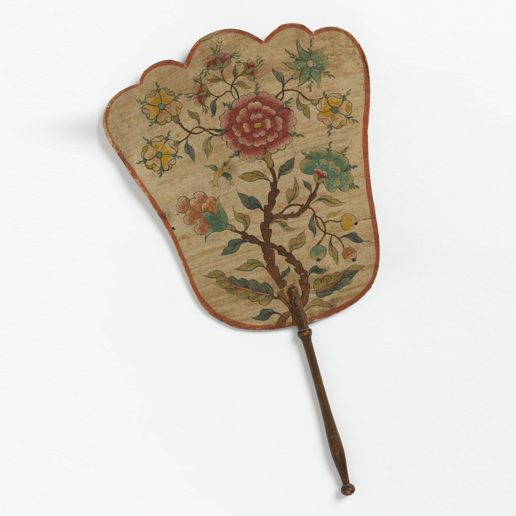 This is a Handscreen. It is dated late 18th–early 19th century and we acquired it in 1925. Its medium is painted paper leaf, turned wood handle. It is a part of the Textiles department.