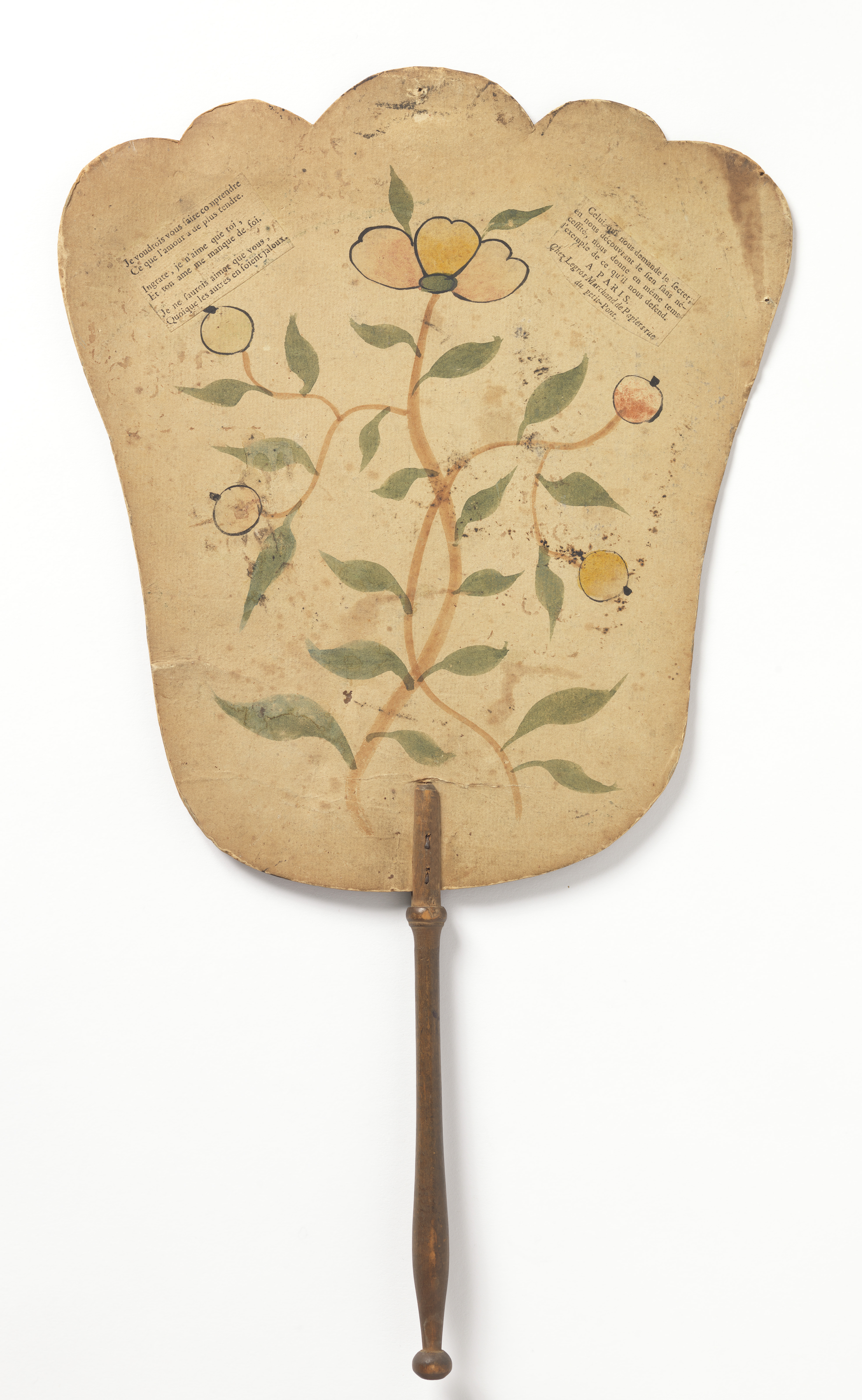 Handscreen (France); painted paper leaf, turned wood handle; Purchased for the Museum by the Advisory Council; 1925-1-54