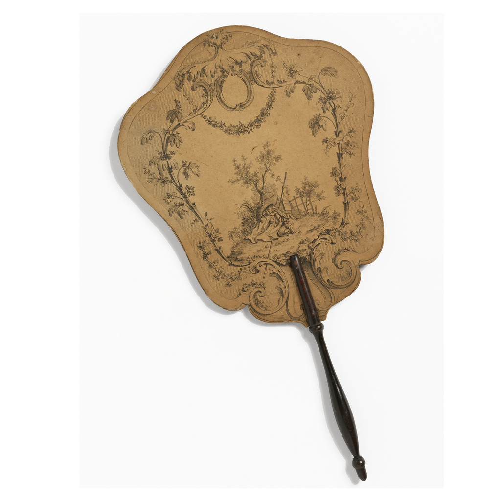 This is a Handscreen. It is dated mid- 18th century and we acquired it in 1925. Its medium is engraved paper leaf, turned wood handle. It is a part of the Textiles department.