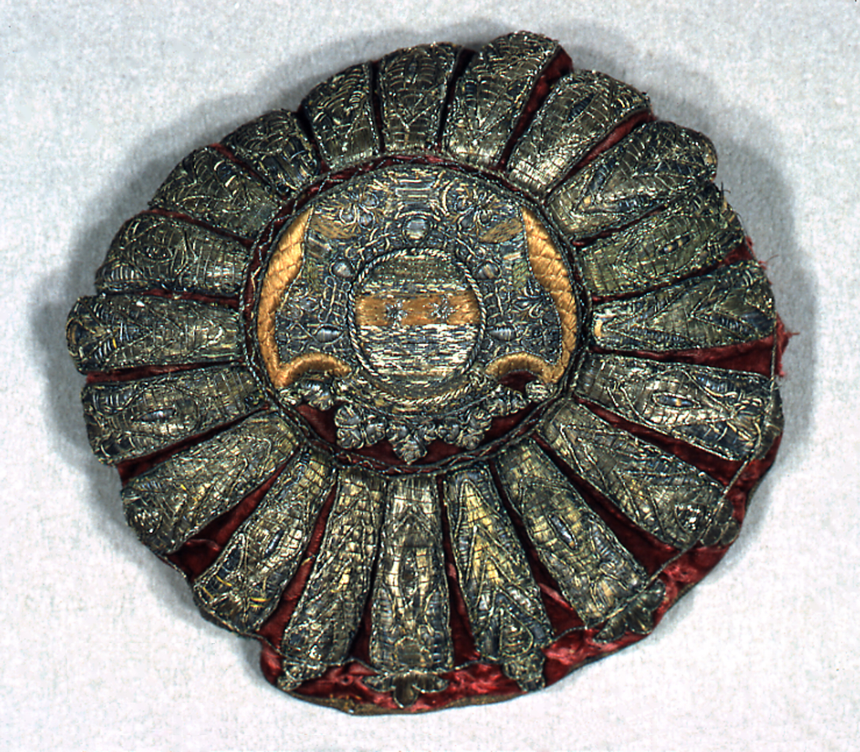 This is a Gaming purse. It is dated 17th century and we acquired it in 1926. Its medium is silk, metal thread and its technique is embroidered on velvet. It is a part of the Textiles department.