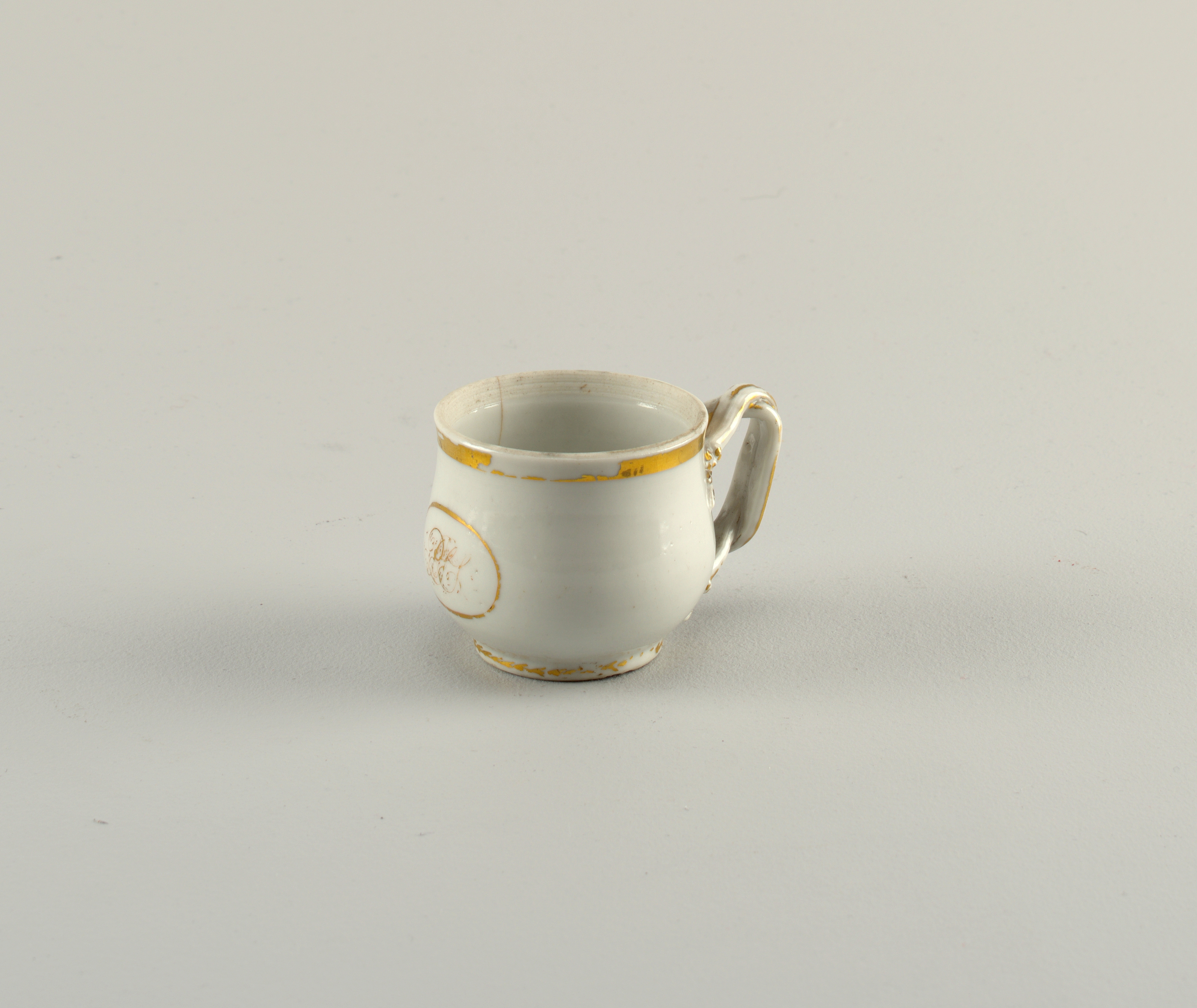 This is a cup. It is dated late 18th century and we acquired it in 1926. Its medium is porcelain, gold. It is a part of the Product Design and Decorative Arts department.