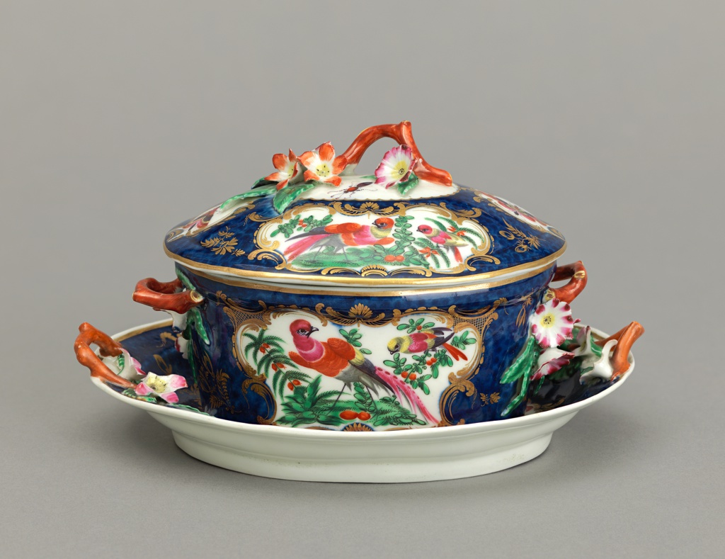 Tureen and Stand Tureen And Stand; Possibly by James Giles (British, 1718 - 1780); Manufactured by Royal Worcester (England, GB, United Kingdom); soft paste porcelain, vitreous enamel, gold; H x W x D (a: dish): 5.6 × 15.5 × 9.5 cm (2 3/16 × 6 1/8 × 3 3/4 in.) H x W x D (b: cover): 4.5 × 13.5 × 10.5 cm (1 3/4 × 5 5/16 × 4 1/8 in.) H x W x D (c: tray): 4 × 19 × 15 cm (1 9/16 × 7 1/2 × 5 7/8 in.); Bequest of Mrs. John Innes Kane; 1926-22-475-a/c