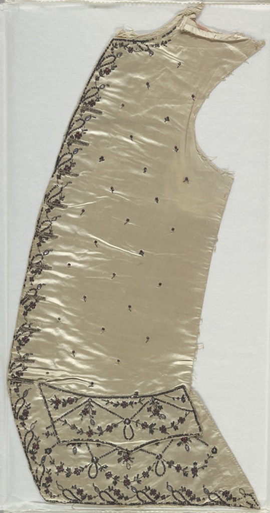 This is a Waistcoat panel. It is dated late 18th century and we acquired it in 1926. Its medium is silk, metallic thread, metal sequins, colored foil, glass beads. It is a part of the Textiles department.